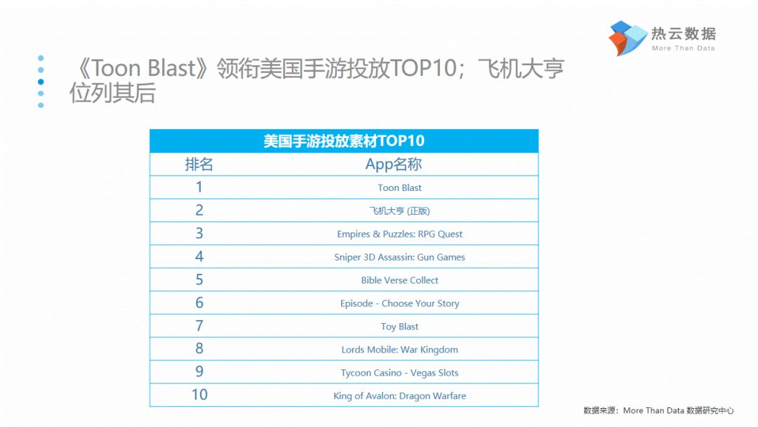 《风之大陆》与《放置奇兵》是2018年国内投放素材最丰富的两款手游;《Toon Blast》则领衔11-12月美国手游投放市场;