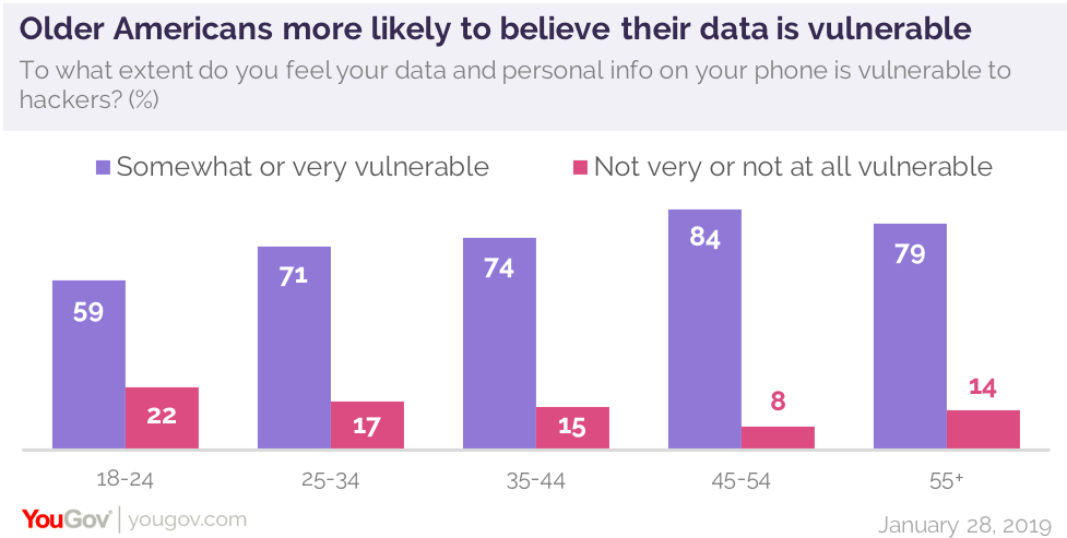 年长的美国人更可能认为自己手机上的个人信息有些或非常脆弱。将近79%的美国老年人(55岁及以上)认为他们的数据容易受到黑客的攻击,相比之下,只有59%的年轻人(18-24岁)这么说。45-54岁的美国人(84%)最有可能认为他们的数据是脆弱的。