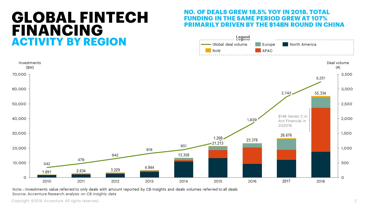 埃森哲的最新调查发现,2018年全球金融科技投资飙升,中国的投资占主导地位,英国的投资大幅上升。