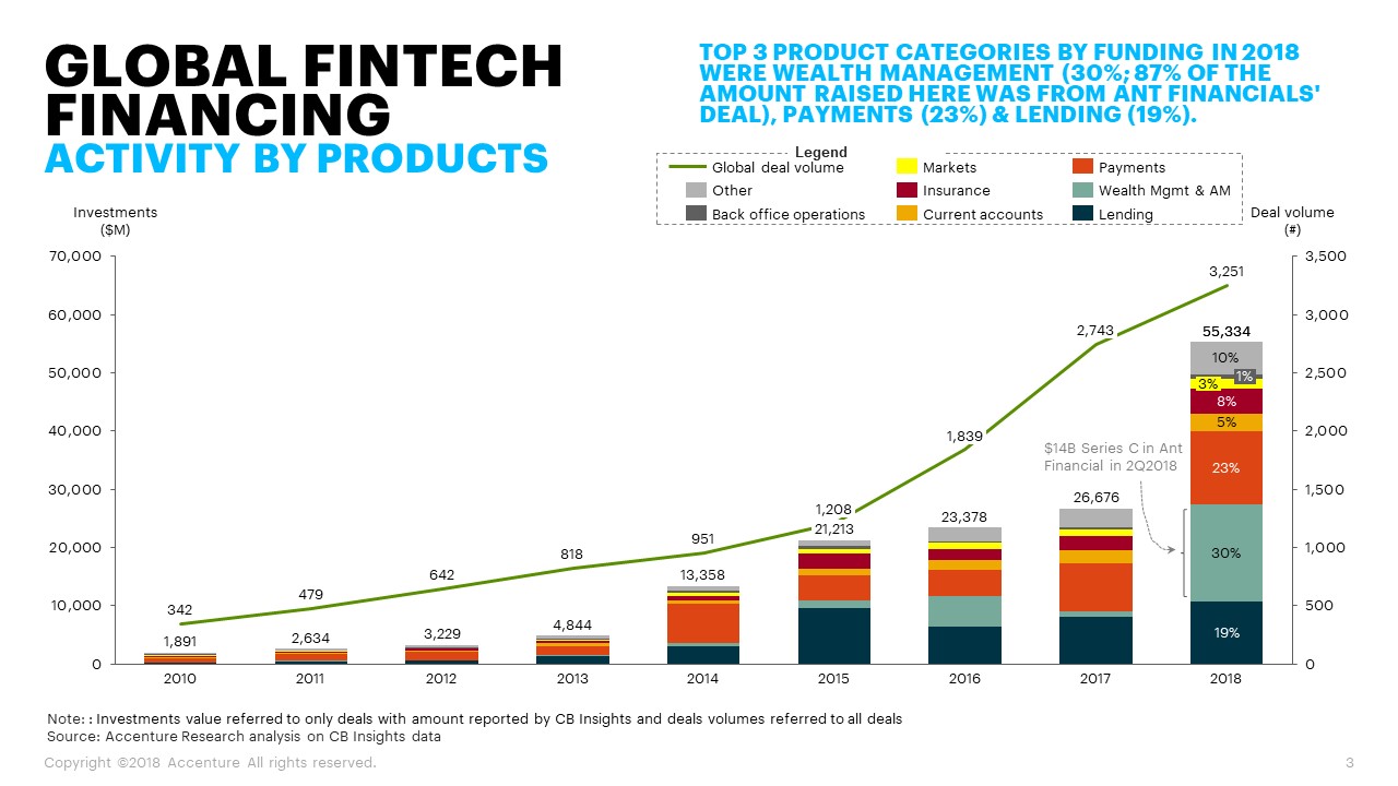 埃森哲将蚂蚁金服的融资归类为财富和资产管理类,这类投资占全球投资总额的30%。支付型初创企业占金融科技融资的23%,贷款型企业占19%。