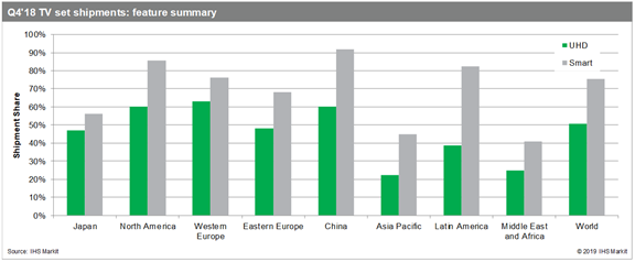 伦敦(2019年3月7日)——2018年,全球电视市场增长2.9%,出货量达到2.21亿台,这主要得益许多消费者升级电视观看世界杯足球赛,从而令上半年销量激增。具有丰富功能的电视出货量持续增长。事实上,根据IHS Markit(纳斯达克股票代码:INFO)的统计,2018年第四季度,有史以来第一次全球电视出货量中有超过一半是超高清电视,并且电视屏幕尺寸也在不断扩大。