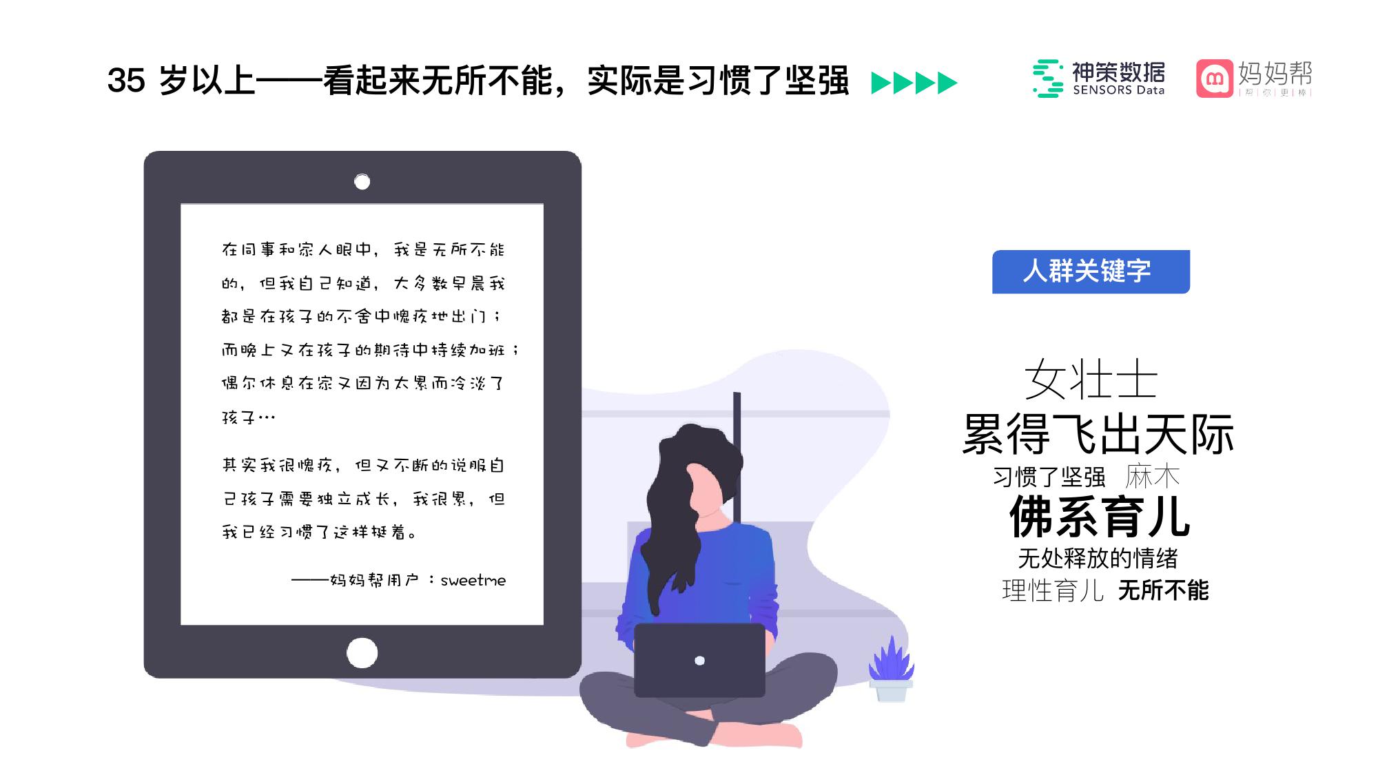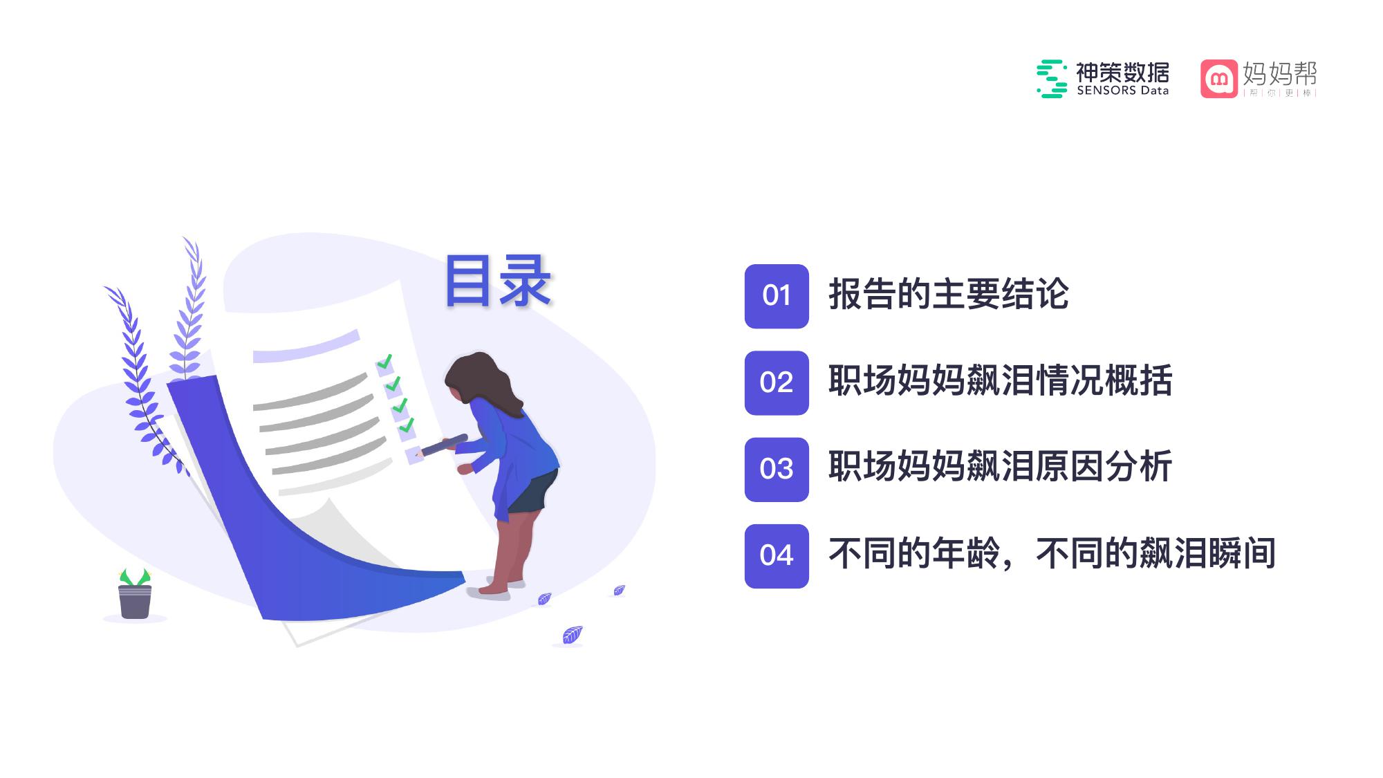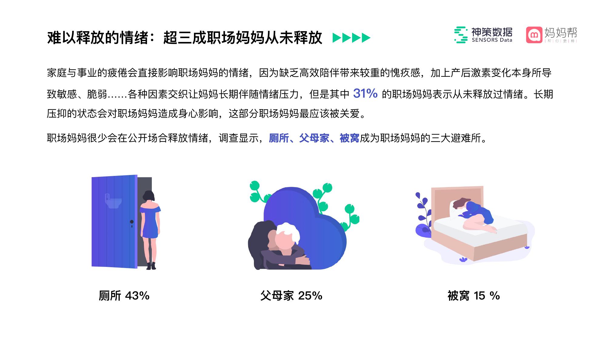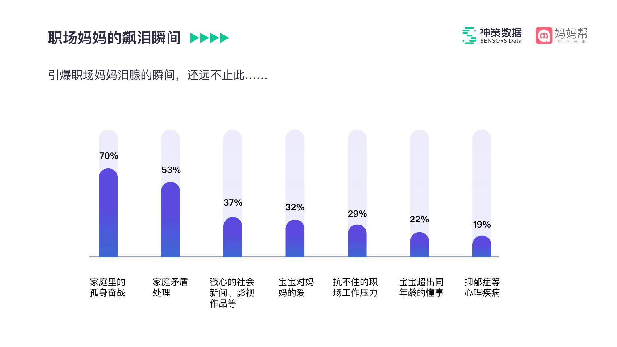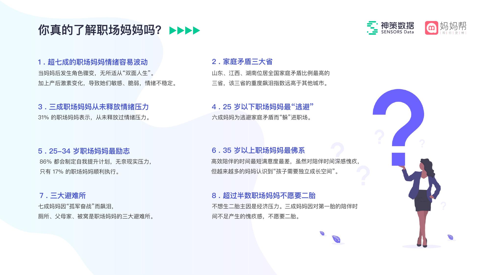 神策数据·用户行为洞察研究院与妈妈帮联合推出研究报告《职场妈妈的飙泪指数》,这是一篇关于职场妈妈情绪调研的报告。神策数据与妈妈帮针对职场妈妈人群进行了分层随机抽样研究,在 2000 条数据样本中,抽取 941 个准确有效样本。希望这份报告提供职场妈妈的情绪认知之外,能够推动社会、家庭关爱职场妈妈,并获取可执行的操作参考。
