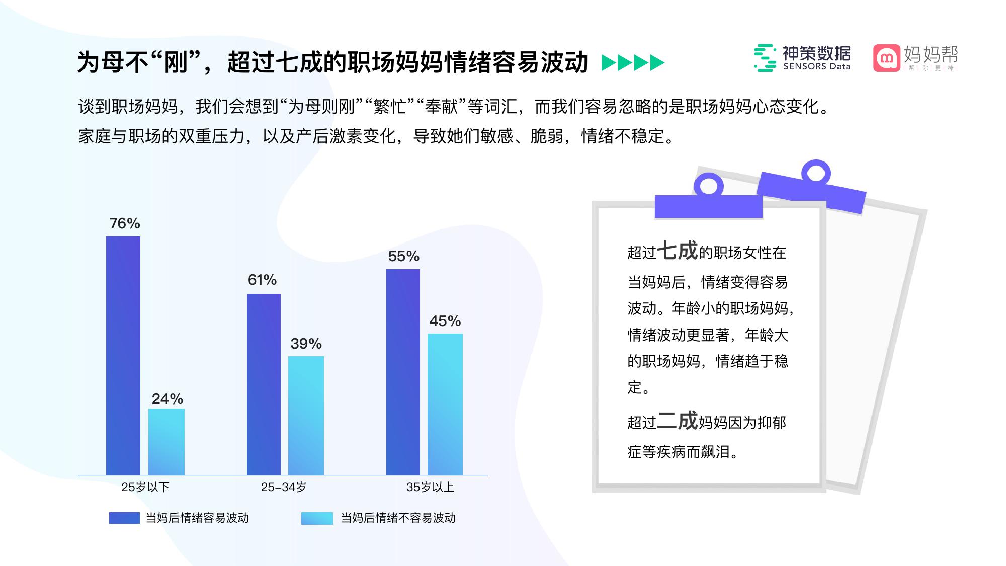 随着我国女性的教育程度越来越高,女性在社会和职场上的角色越来越重要,同时肩负者怀孕、生产、育儿不可或缺的角色——妈妈。当双重人生开启后,职场妈妈的生活工作都发生了翻天覆地的变化,加上产后激素的变化,职场妈妈的情绪也发生了较大的变化。
