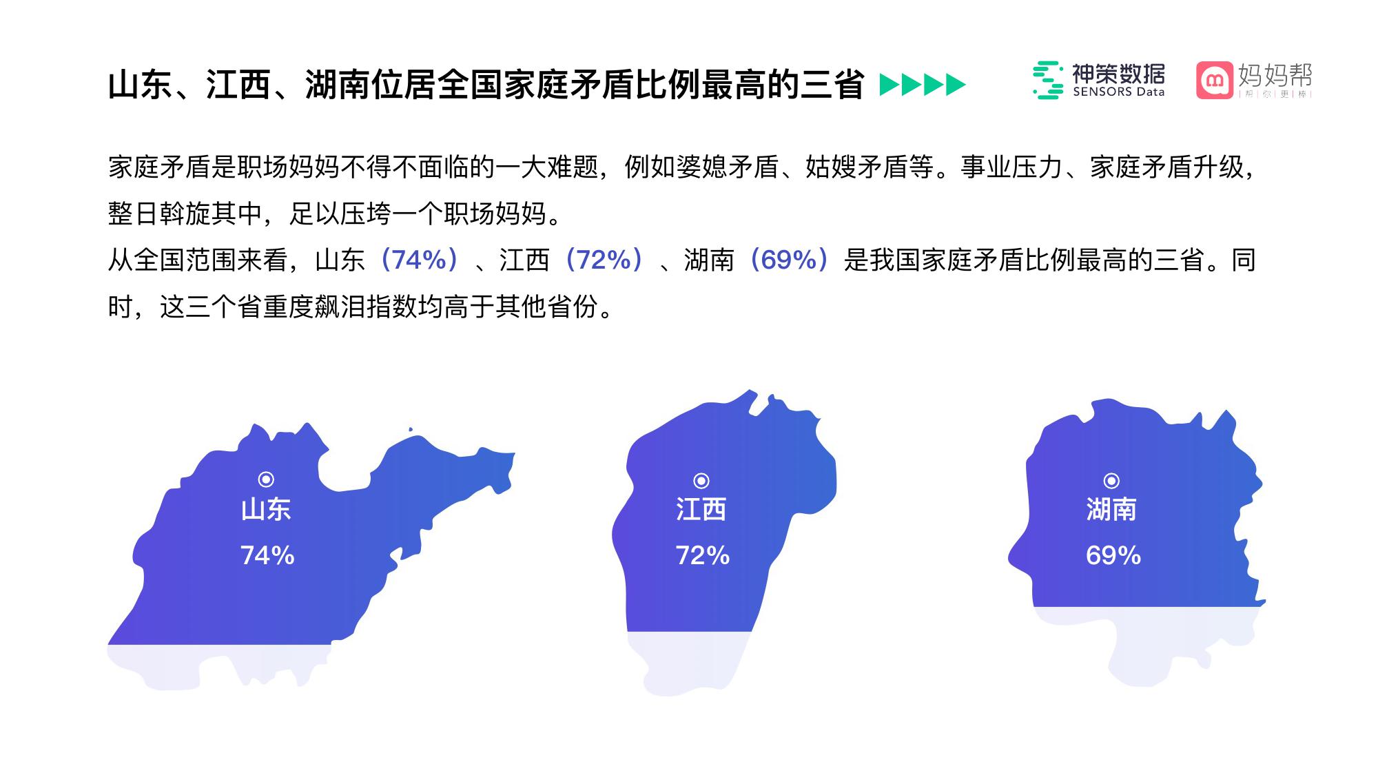 事业压力、家庭矛盾升级,整日斡旋其中,足以压垮一个职场妈妈。调查发现,山东、江西、湖南位居全国家庭矛盾比例最高的三省。