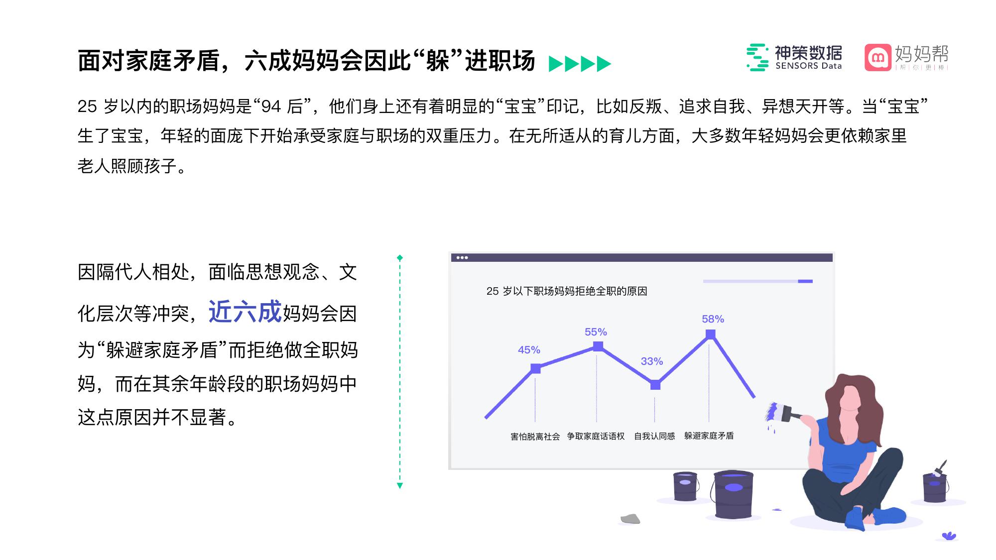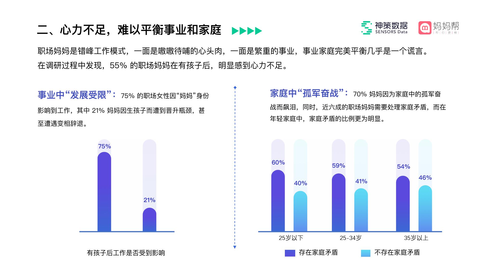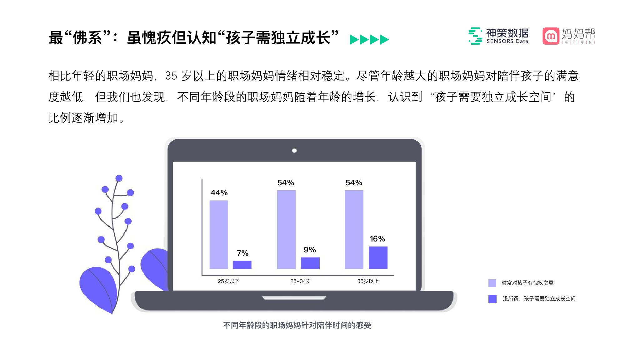 本报告将职场妈妈分为三种年龄段:25 岁以下、25-34岁、35 岁以上,阅历和职场压力积累造就了三类职场妈妈不同的承受力、不同的事业心、不同的育儿观,报告分类呈现三类职场妈妈的特点和差异,直述职场妈妈的艰辛与不易,同时侧面刻画出坚强、始终上进的中国职场女性。