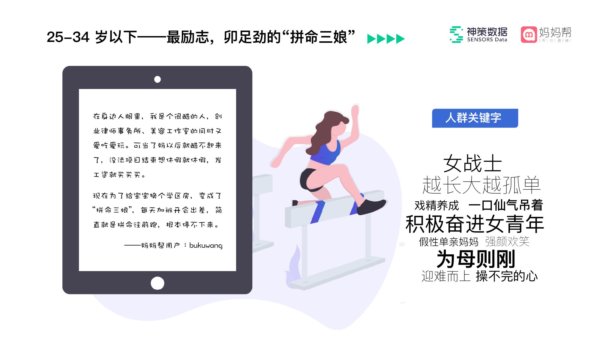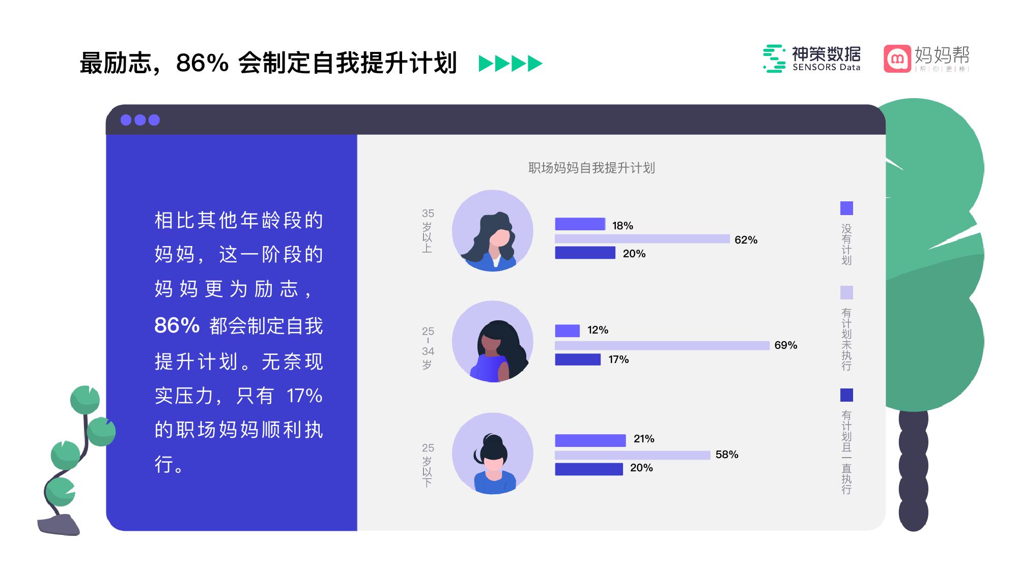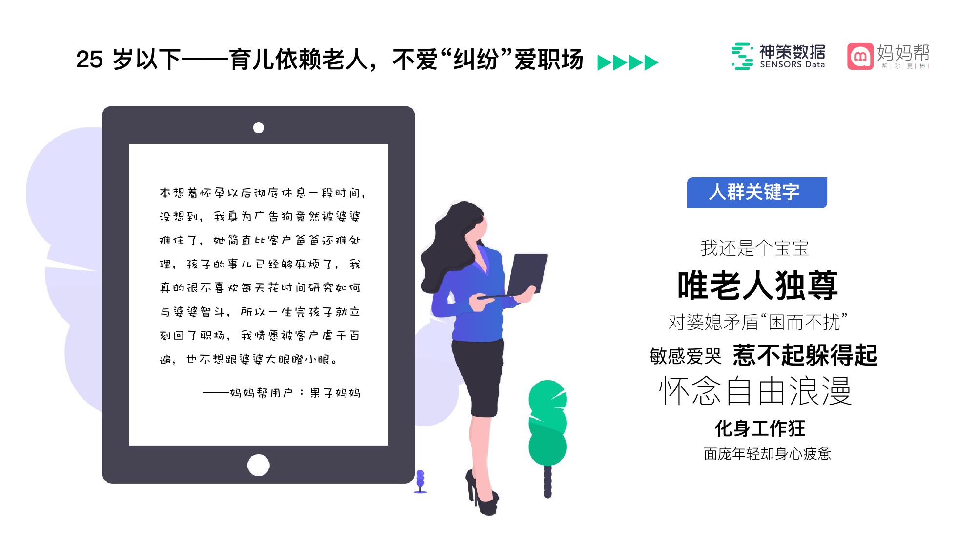 本报告将职场妈妈分为三种年龄段:25 岁以下、25-34岁、35 岁以上,阅历和职场压力积累造就了三类职场妈妈不同的承受力、不同的事业心、不同的育儿观,报告分类呈现三类职场妈妈的特点和差异,直述职场妈妈的艰辛与不易,同时侧面刻画出坚强、始终上进的中国职场女性。
