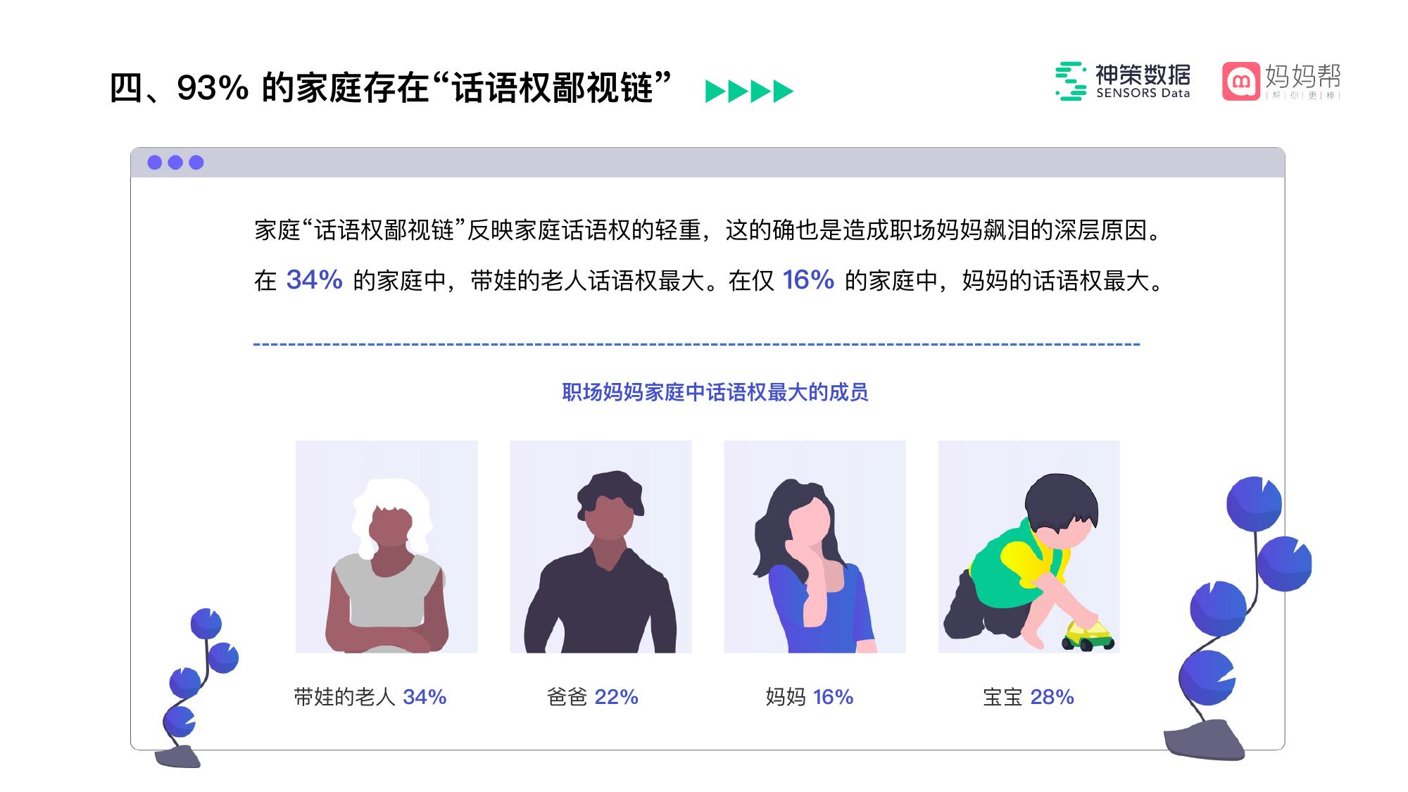 除家庭矛盾外,家庭鄙视链也是造成职场妈妈飙泪的深层原因。家庭鄙视链反应家庭成员的话语权的轻重。在 34% 的家庭中,带娃的老人话语权最大。在仅 16% 的家庭中,妈妈的话语权最大。话语权差异化的家庭中,家庭环境差异塑造性格迥异的职场妈妈。