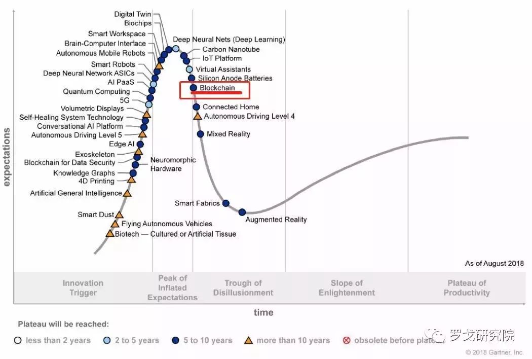 从以下Gartner 2018年8月发布的技术成熟度曲线来看,总体趋势上,区块链技术已经从一个科技诞生的萌芽期和过热的泡沫期,走到破灭的底谷期,从一个预计要十年以上才能成熟的技术走向一个预计将在5-10年内达到成熟期的技术。