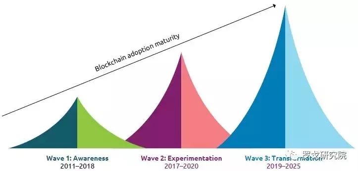图11展示了区块链技术采用成熟度和时间表。此报告认为,区块链采用的成熟度将分成三个阶段。
