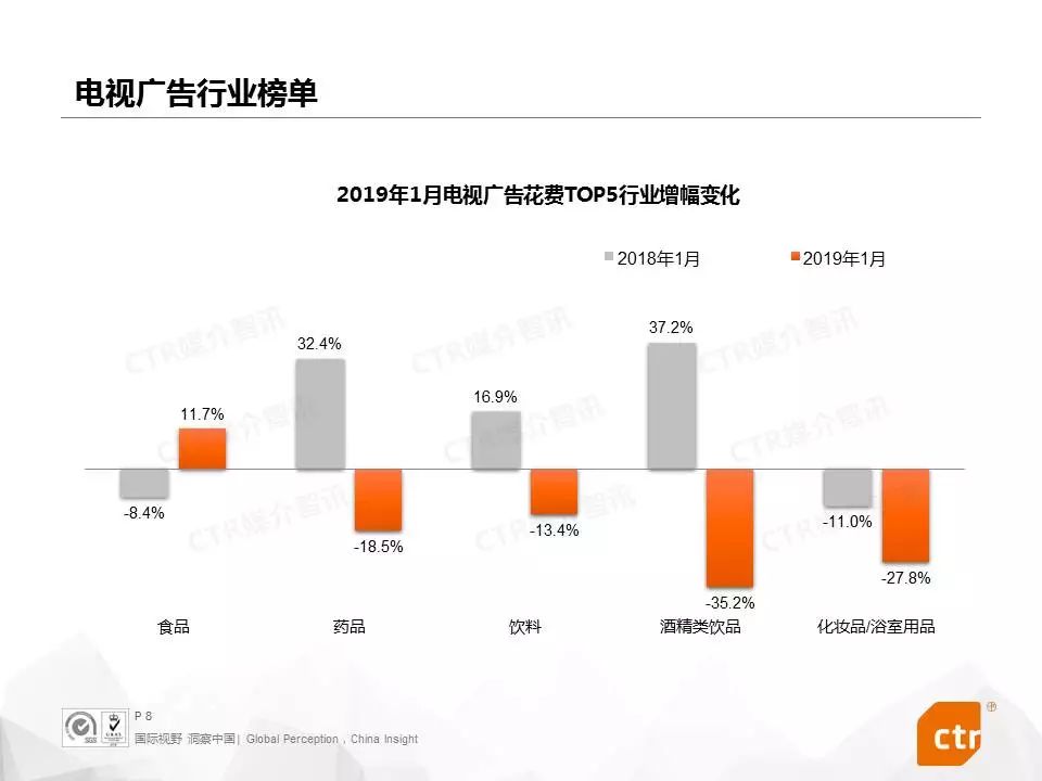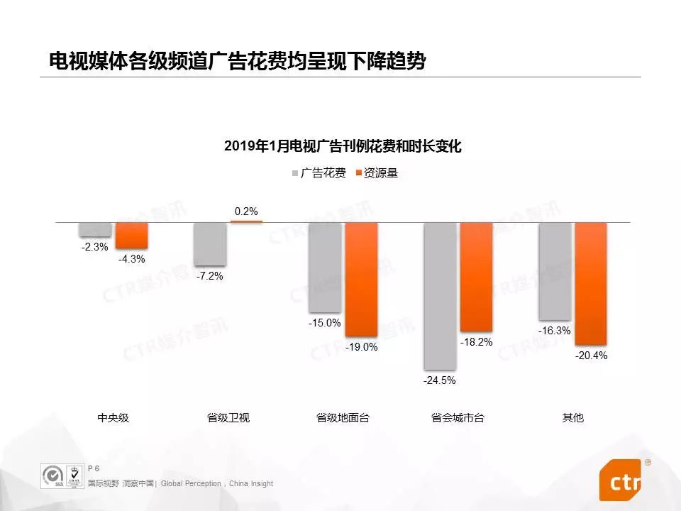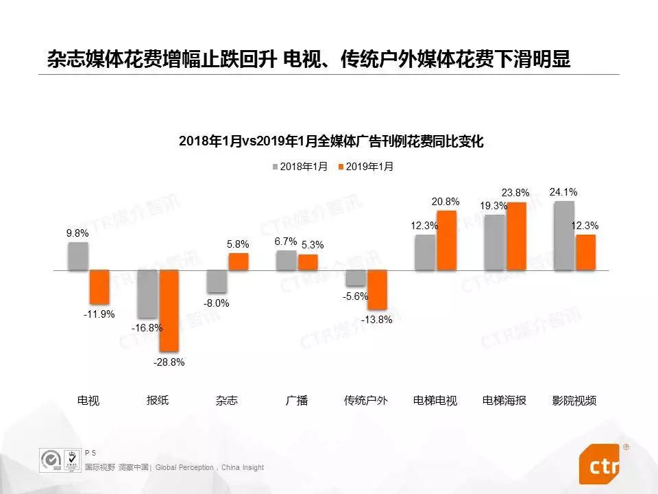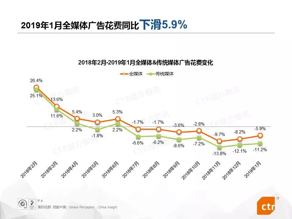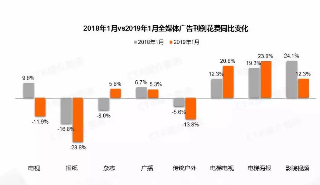CTR媒介智讯公布的数据显示,2019年1月中国广告市场刊例收入同比下降5.9%,传统媒体广告花费同比减少11.2%。传统媒体和全媒体的广告花费月度降幅有所收窄,但同去年相比还是处于持续下滑的状态。