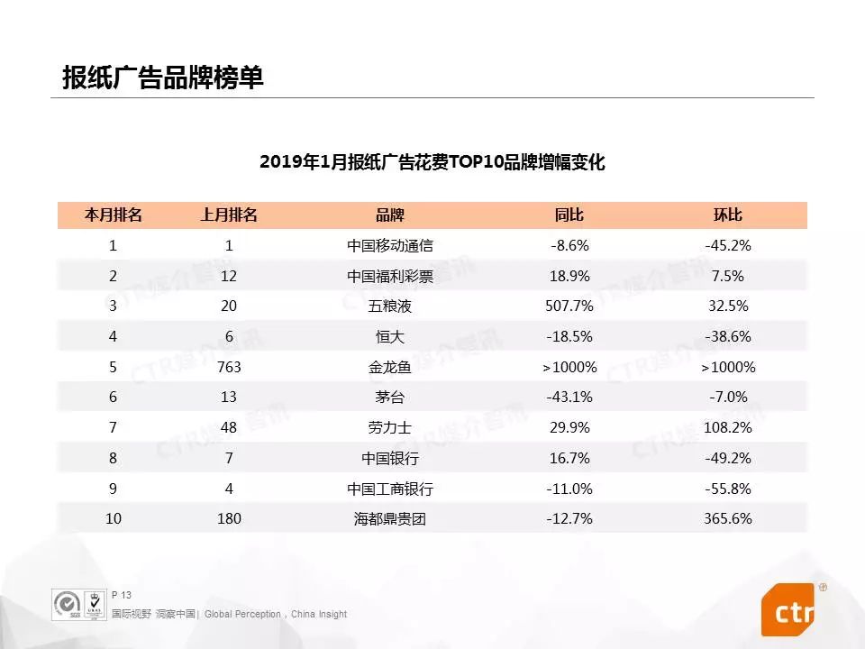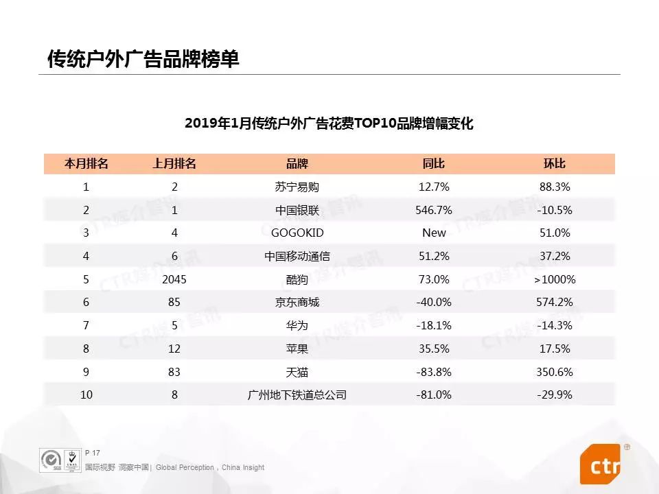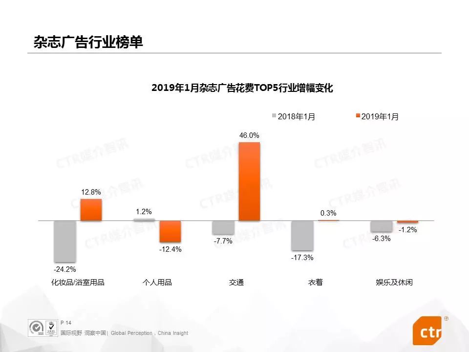 平面媒体方面,杂志1月份的广告花费止跌回升,呈现5.8%的增幅,化妆品/浴室用品、交通行业的广告花费同比上涨明显。