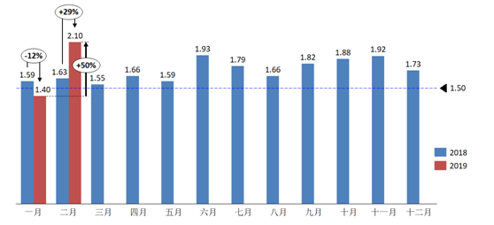 2019年3月10日,中国汽车流通协会发布2019年2月份“汽车经销商库存”调查结果:2月份汽车经销商综合库存系数为2.1,同比上升29%,环比上升50%,库存水平位于警戒线以上。