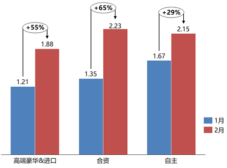 2月份,自主品牌、合资品牌、高端豪华&进口品牌库存系数环比均呈上升趋势。自主品牌库存系数为2.15,环比上升29%;合资品牌库存系数为2.23,环比上升65%;高端豪华&进口品牌库存系数为1.88,环比上升55%。