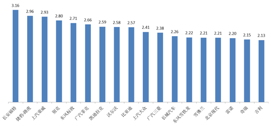 2月份库存深度超过2个月的品牌有18个,分别为长安福特、捷豹-路虎、上汽荣威、别克、东风标致、广汽菲克、凯迪拉克、沃尔沃、比亚迪、上汽大众、广汽三菱、长城汽车、东风雪铁龙、雪佛兰、北京现代、雷诺、奇瑞、吉利。