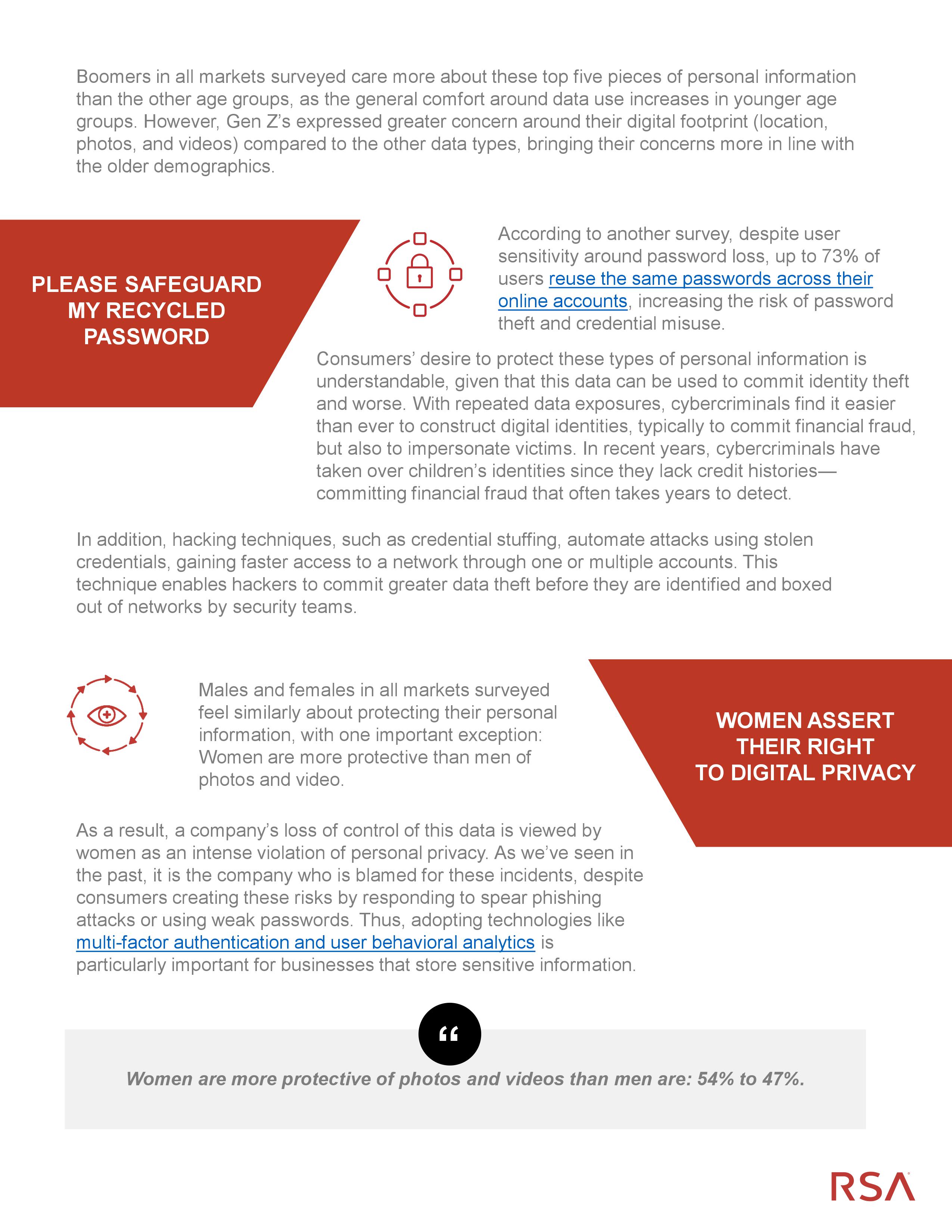 RSA的调查揭示了消费者对数据隐私的看法。不到一半的消费者(48%)相信公司用有道德的手段来使用他们的数据。57%的人认为,如果发生数据泄露事故,公司会凌驾于其他人之上。尽管消费者更加担心自己的隐私,但他们的上网习惯仍然很差,73%的用户承认他们在许多网站上重复使用相同的密码。