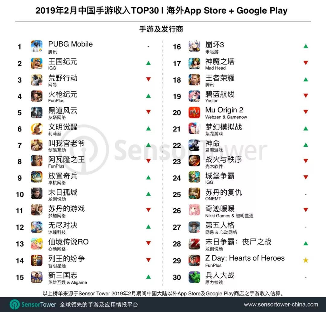 Sensor Tower 商店情报平台最新数据显示,2019年2月期间中国手游产品在海外市场收入排名TOP30。本月中国手游出海营收整体出现回调,表现在榜单多数产品月流水较上个月都有不同程度的下滑,而流水保持稳定意味着排名上升。详细榜单变化如下。