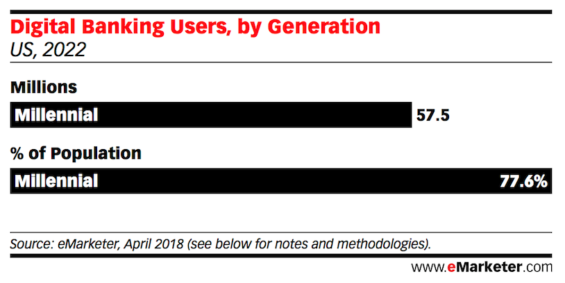 千禧一代对科技服务的需求只会增长。eMarketer预计到2022年5750万美国千禧一代将成为网络银行用户,占千禧一代人口的3/4以上。