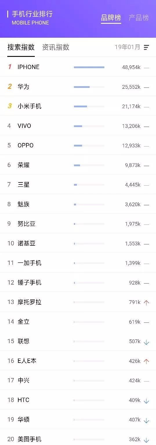 在1月的榜单中,iPhone位列第1名,华为、小米手机、vivo和oppo位列第2-第5名,第6-10名分别为荣耀、三星、魅族、努比亚和诺基亚。