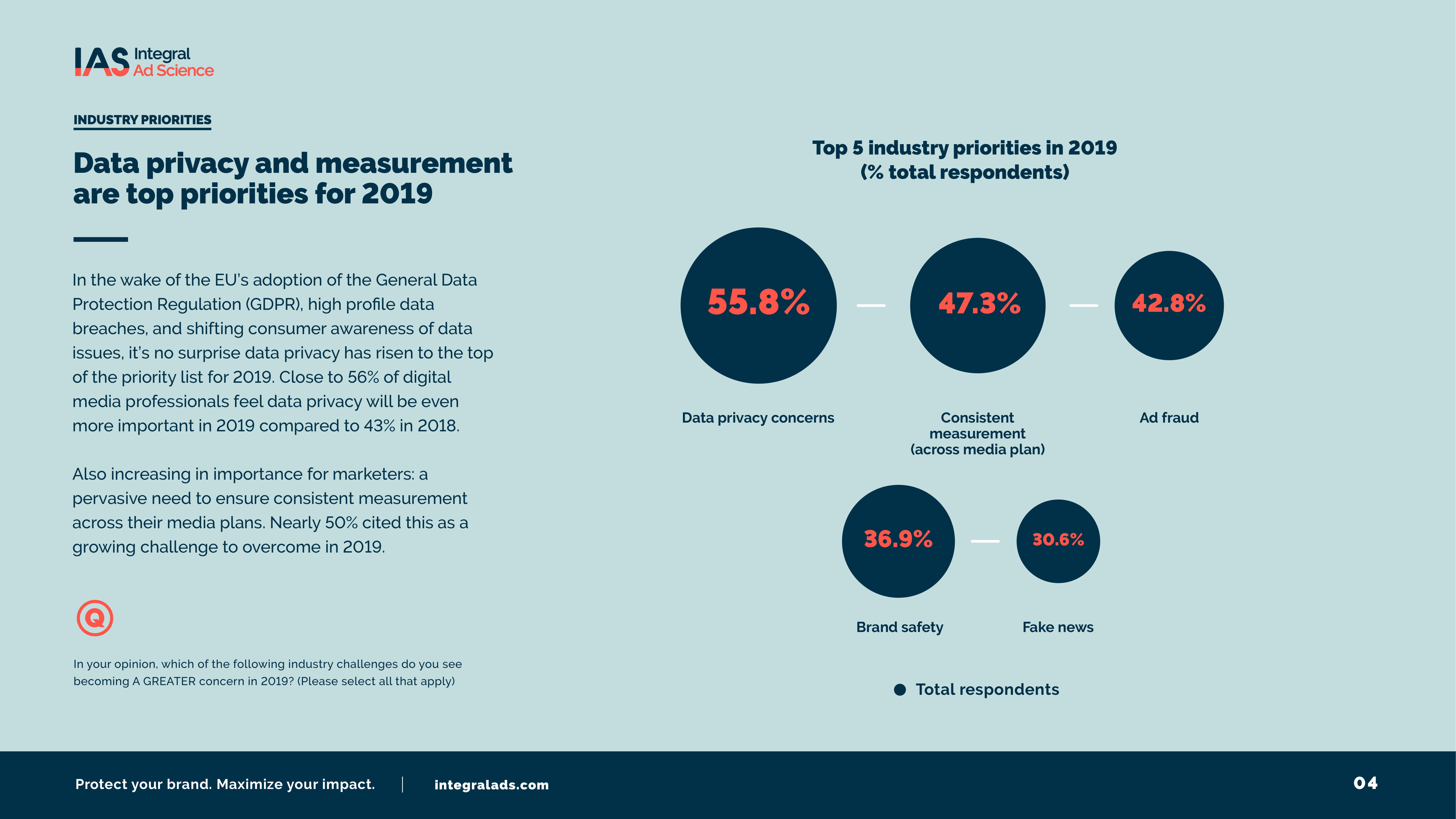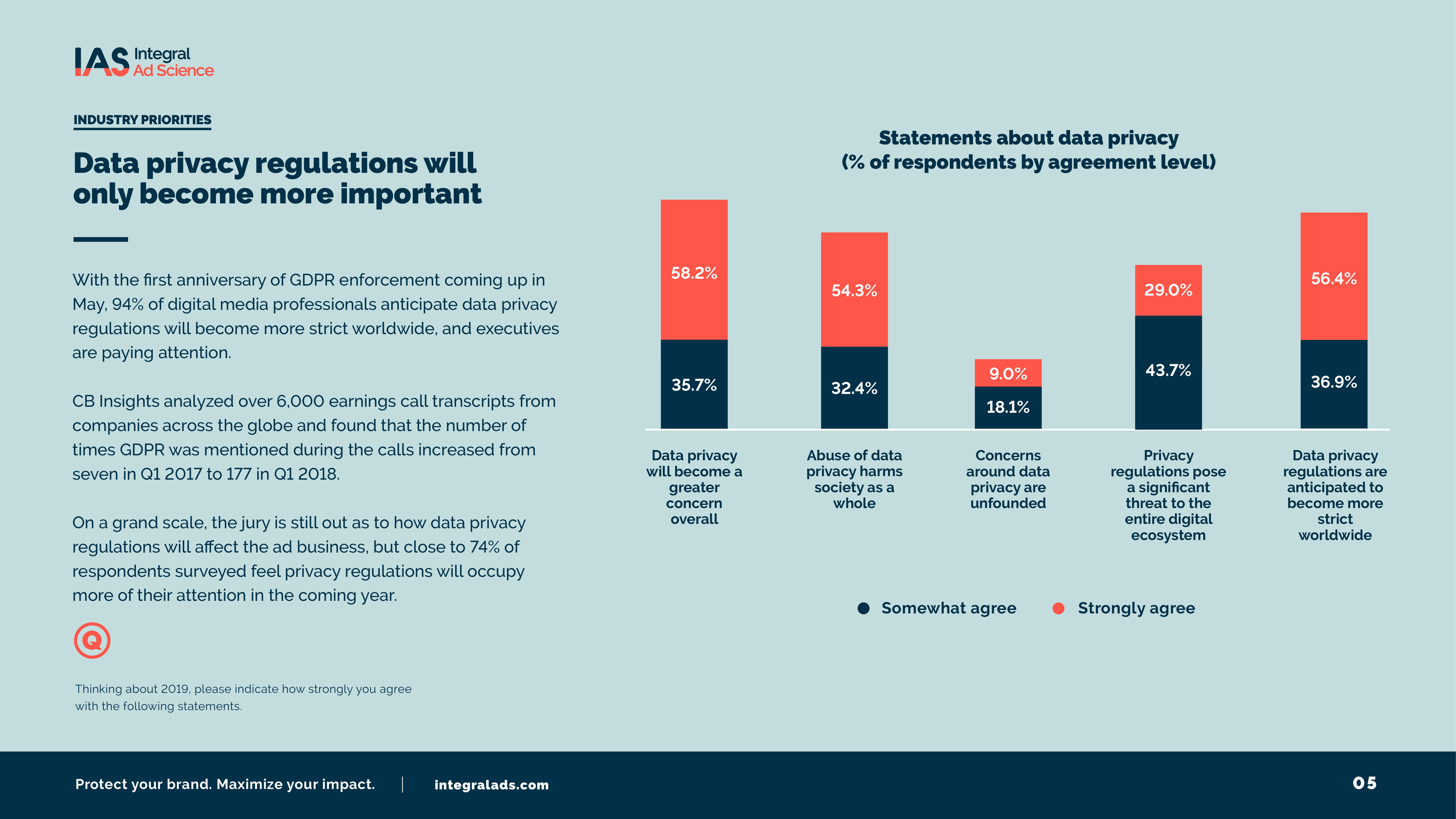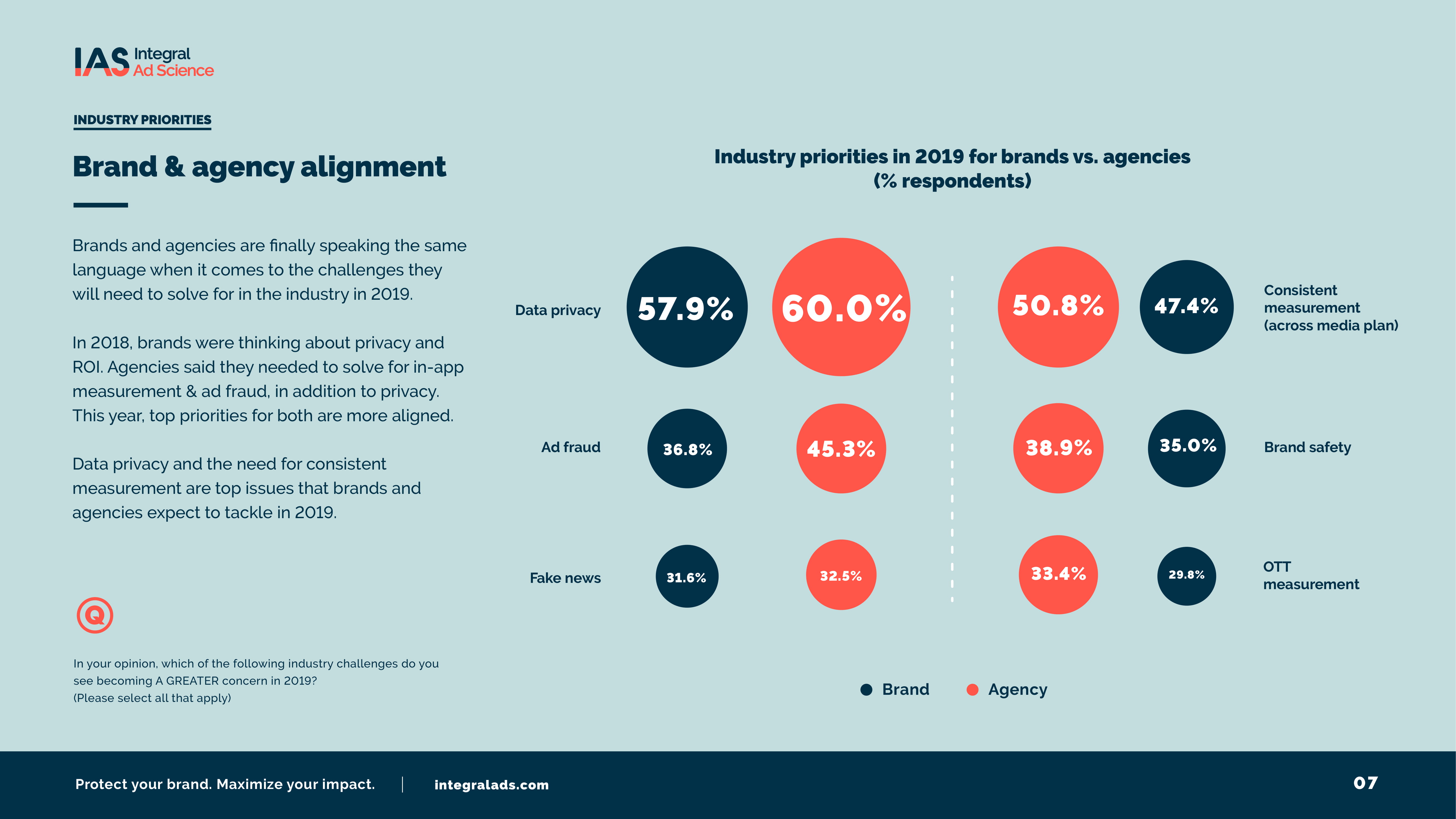 调查结果显示,51.9%的品牌和60.0%的广告代理商认为,2019年数据隐私将成为最大的问题。