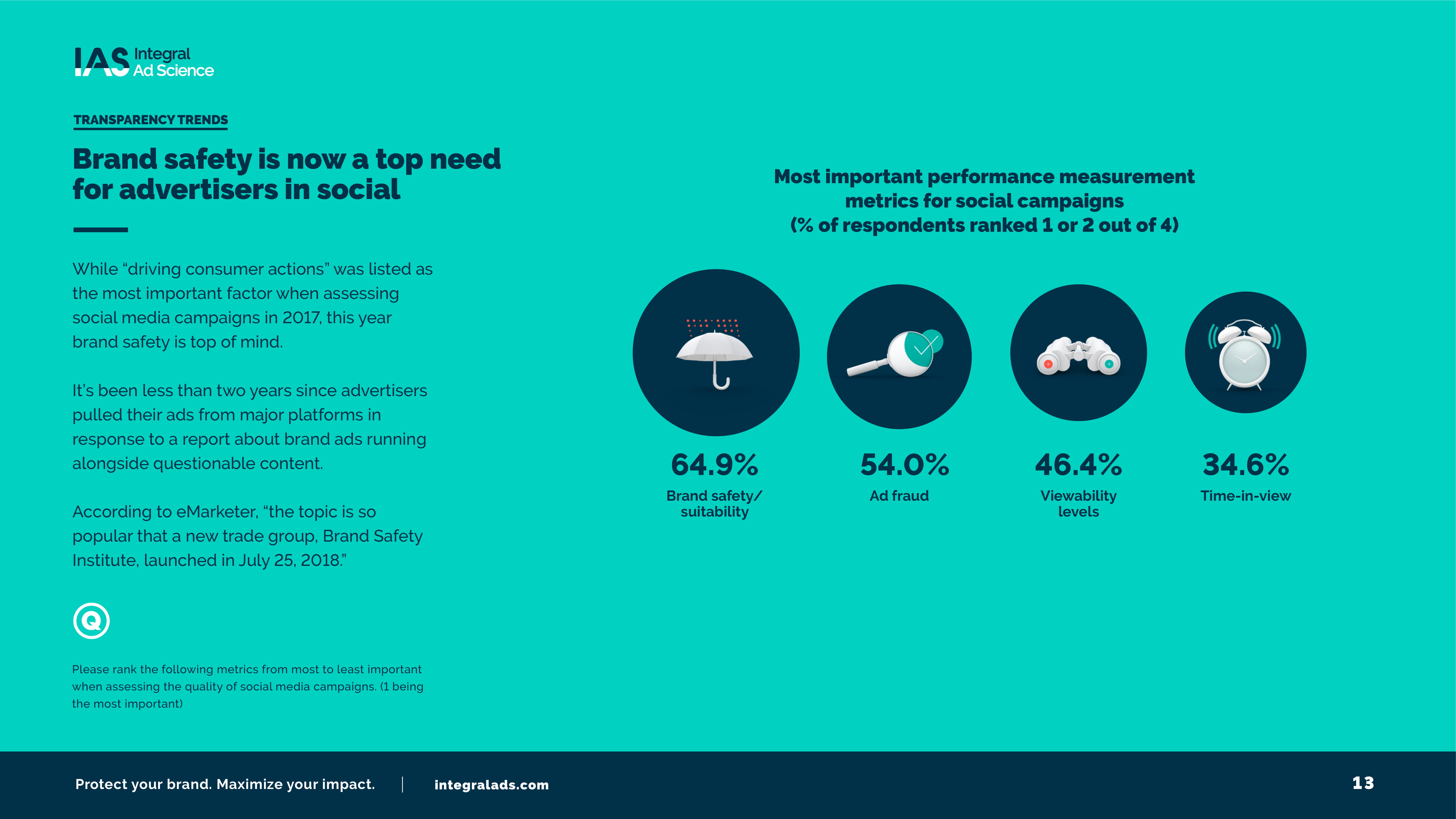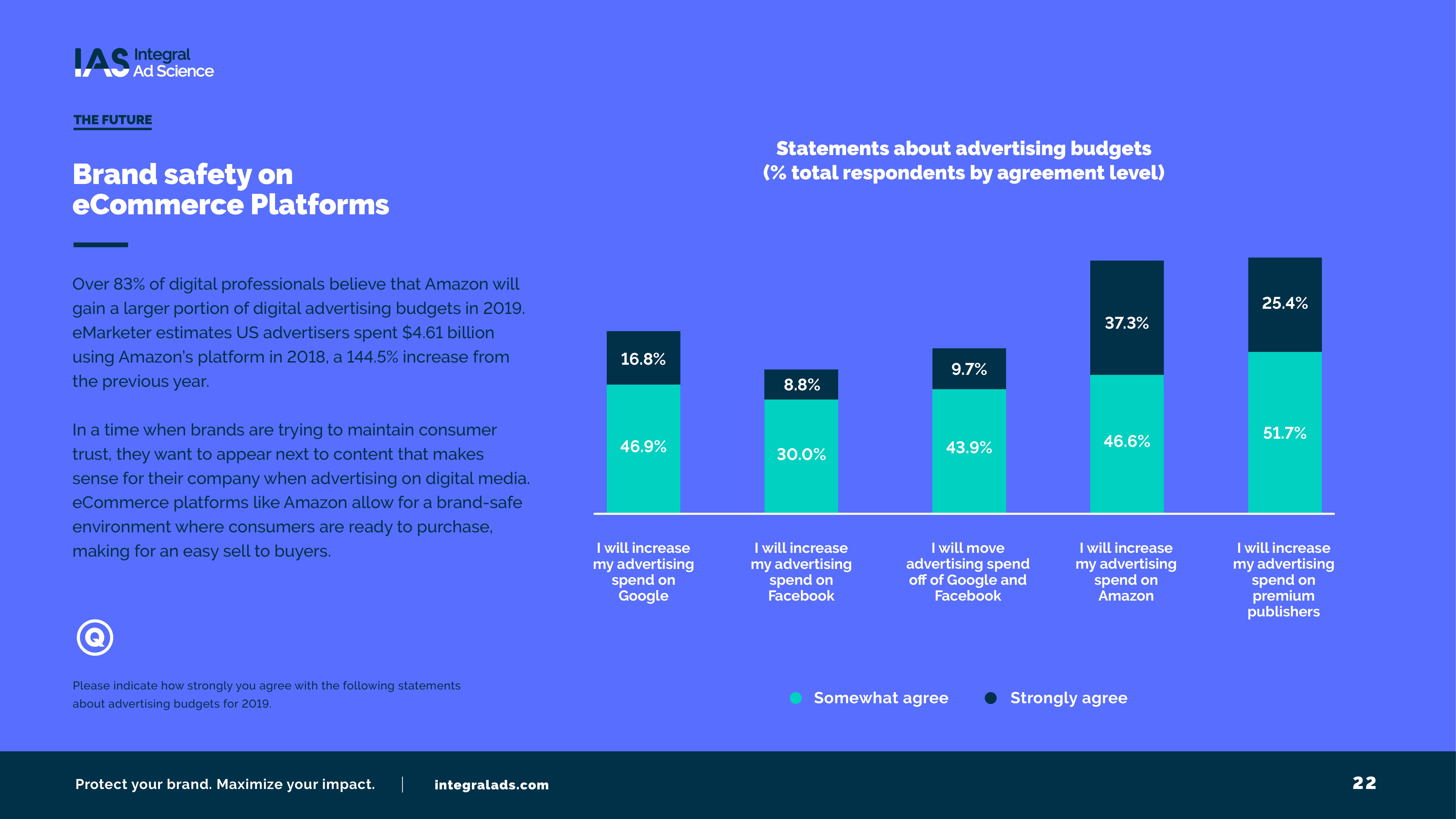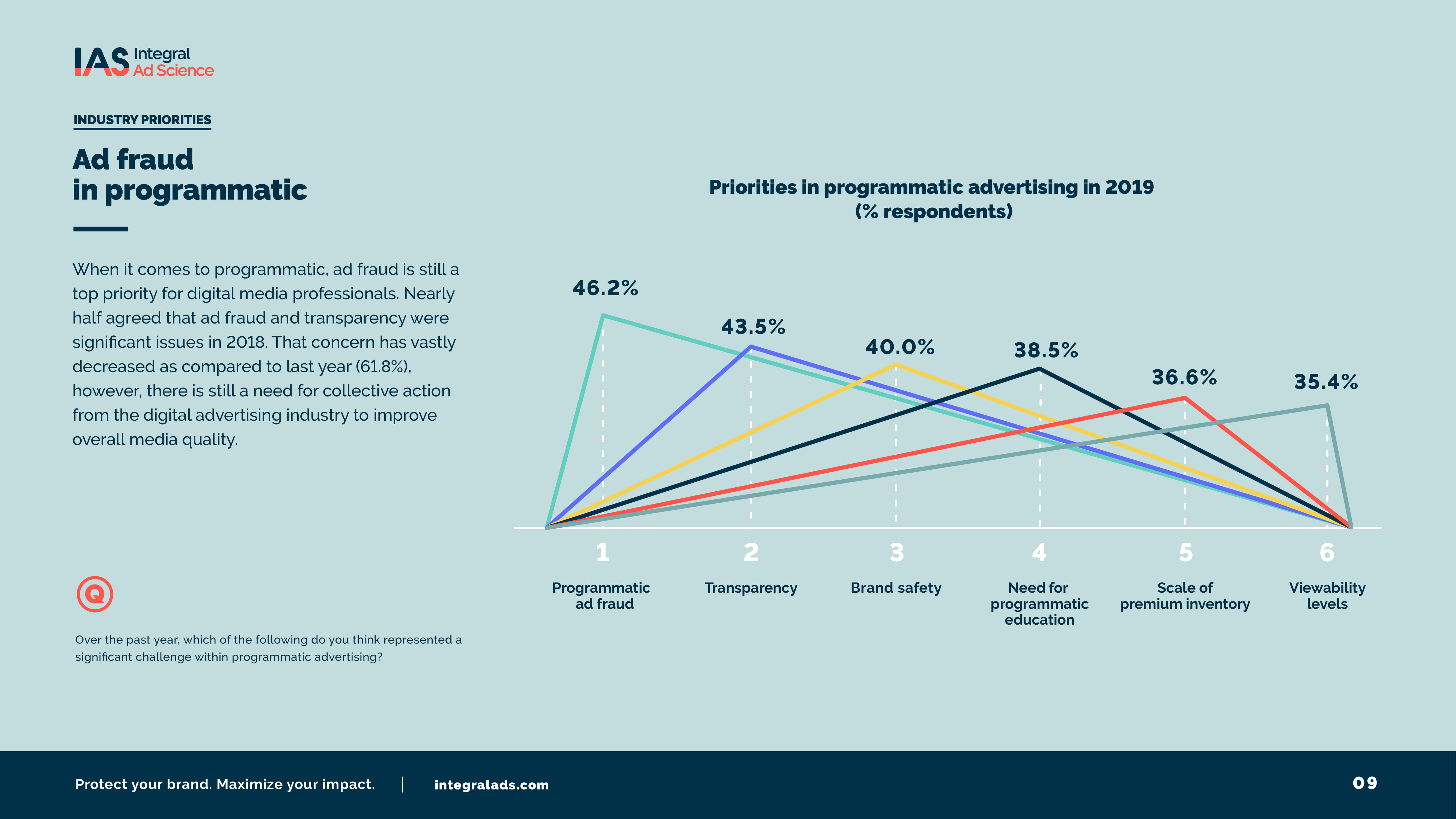 2019年仍然需要找到一种方法来清楚地证明投资回报率。调查结果显示,3/4的品牌(75.4%)和2/3的广告代理商(66%)认为,无法将广告风险与投资回报率或投资回报联系起来,这是网络广告预算的最大威胁。对于代理商而言,对广告预算更具威胁的是调查欺诈性(69%)。