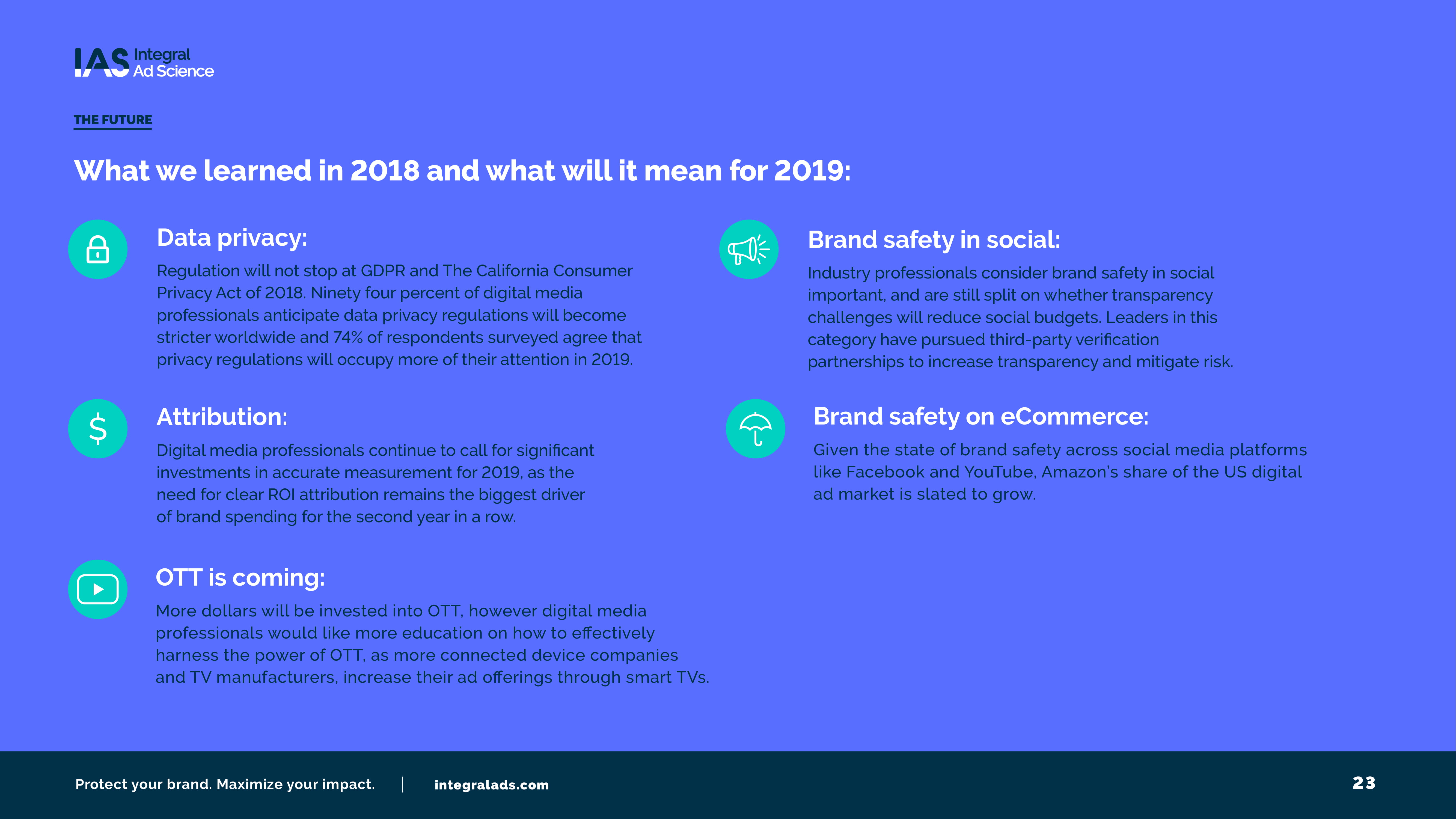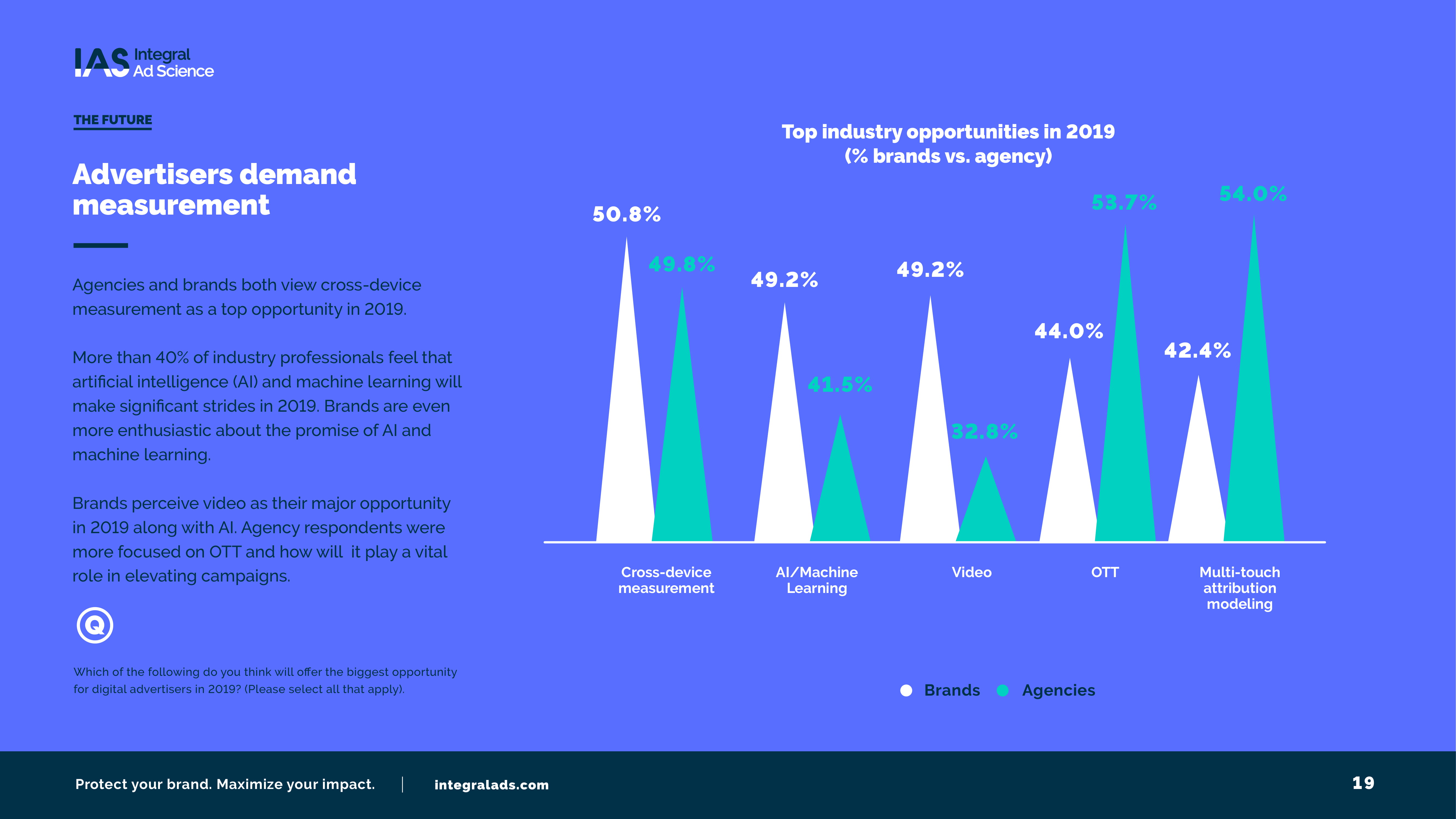 代理商(49.8%)和品牌(50.8%)认为跨设备测量是2019年最大的机遇之一。对于代理商来说,多触点归因建模(54.0%)和OTT(53.7%)的机遇。他们还认为,人工智能(49.2%)和机器学习等先进技术将在2019年提供大量机会。