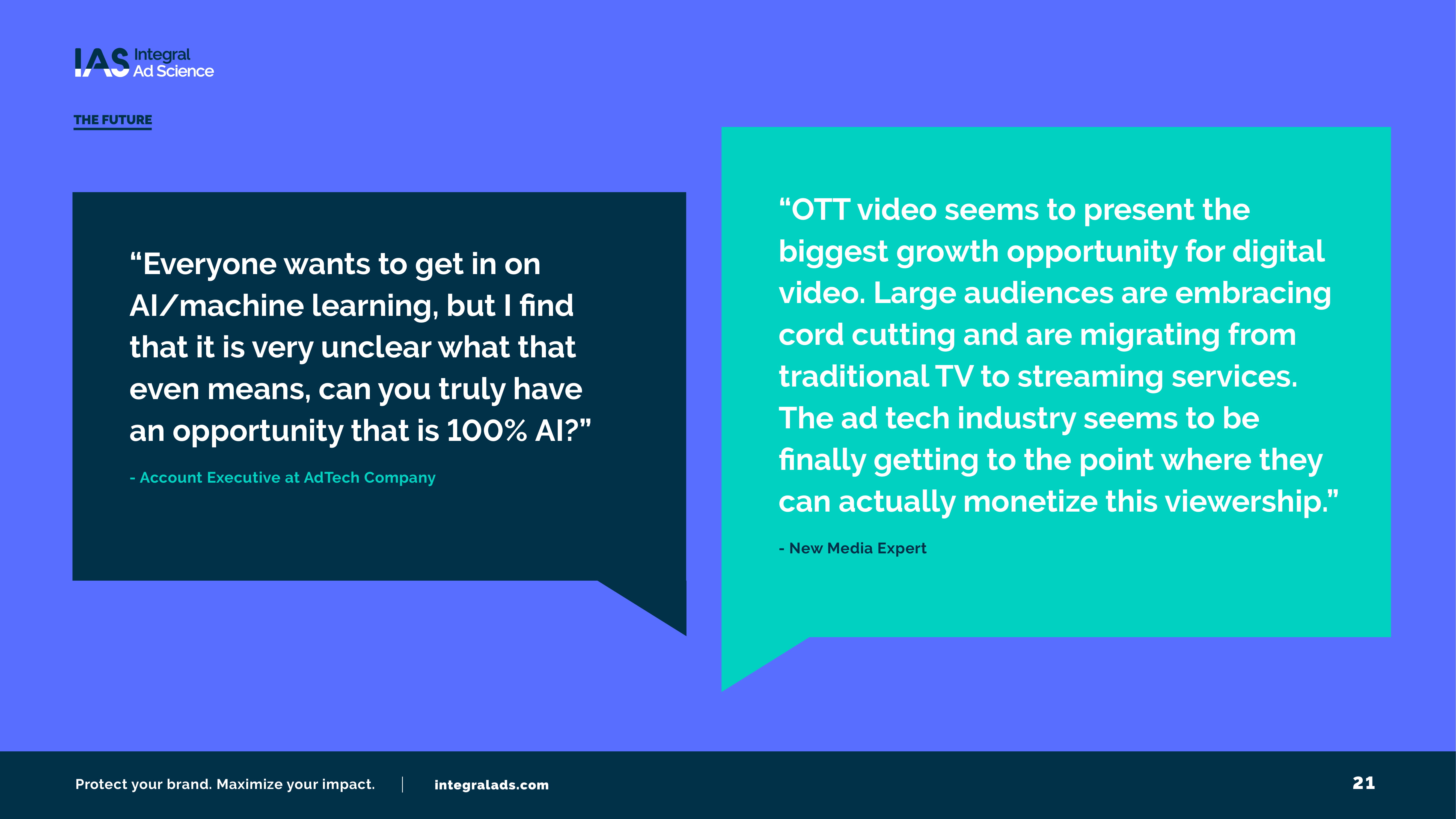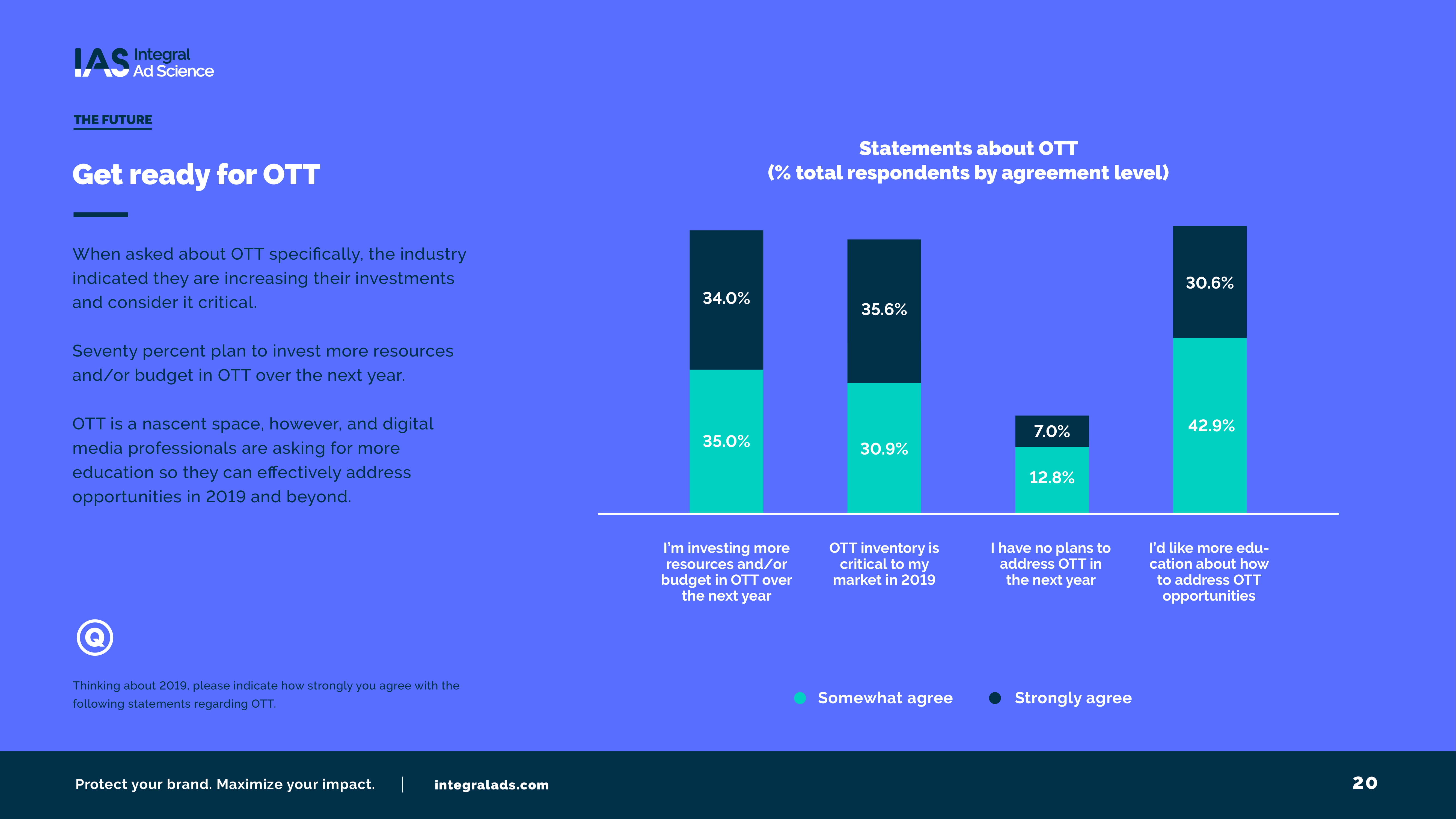 45.5%的网络媒体专业人士表示,第二大机会是OTT,通过互联网向用户提供各种应用服务。5950万户美国家庭在流媒体设备上观看视频,超过一半的媒体买家(56%)投资OTT,7/10的营销专业人士(69%)将在未来的一年中在OTT方面投入更多的资源和预算。