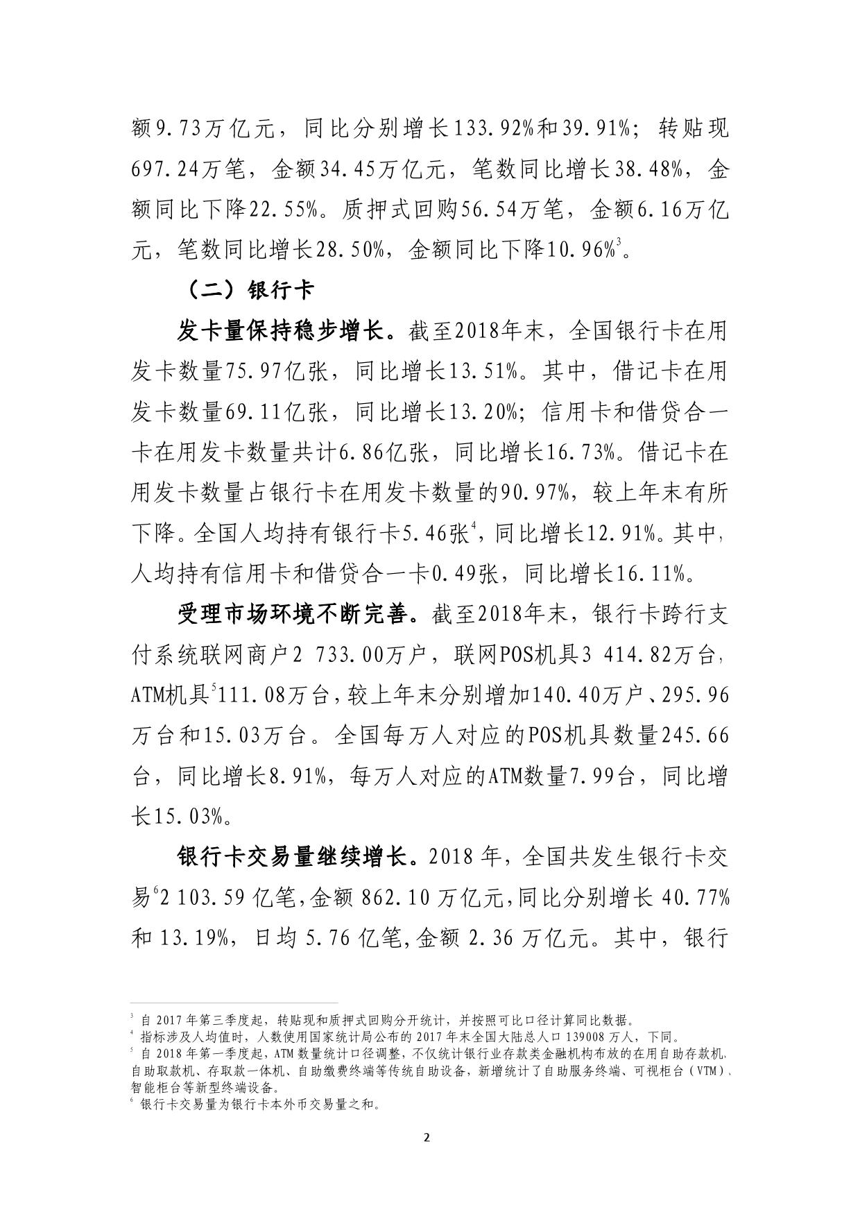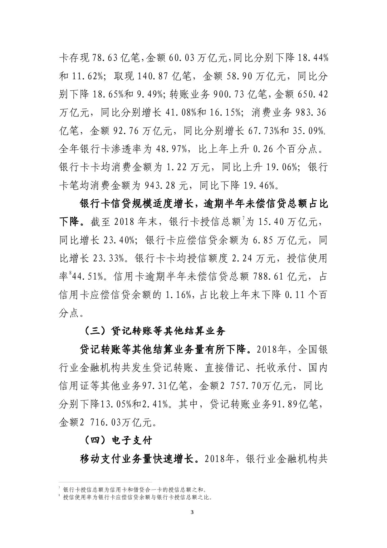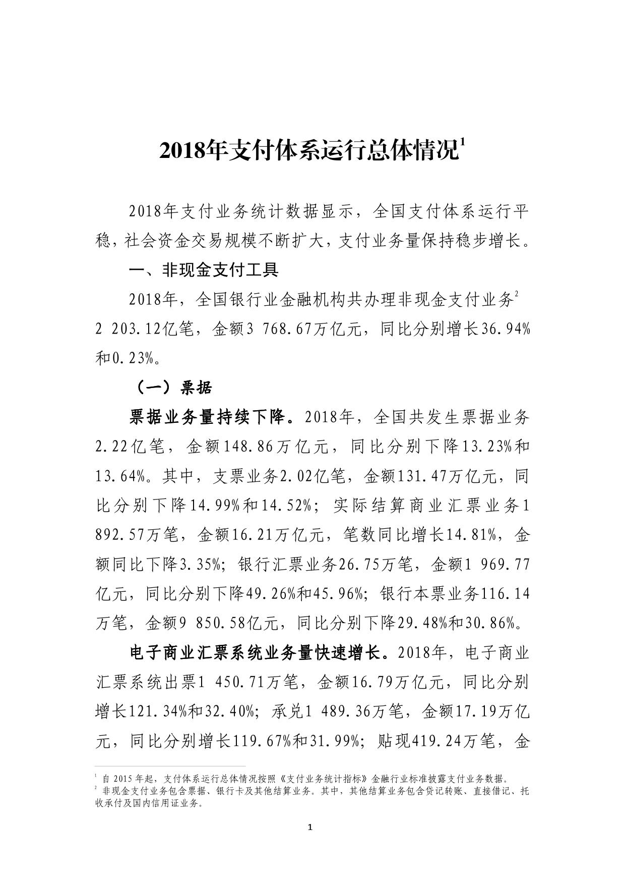 2018年支付业务统计数据显示,全国支付体系运行平稳,社会资金交易规模不断扩大,支付业务量保持稳步增长。全国银行业金融机构共办理非现金支付业务2203.12亿笔,金额3768.67万亿元,同比分别增长36.94%和0.23%。