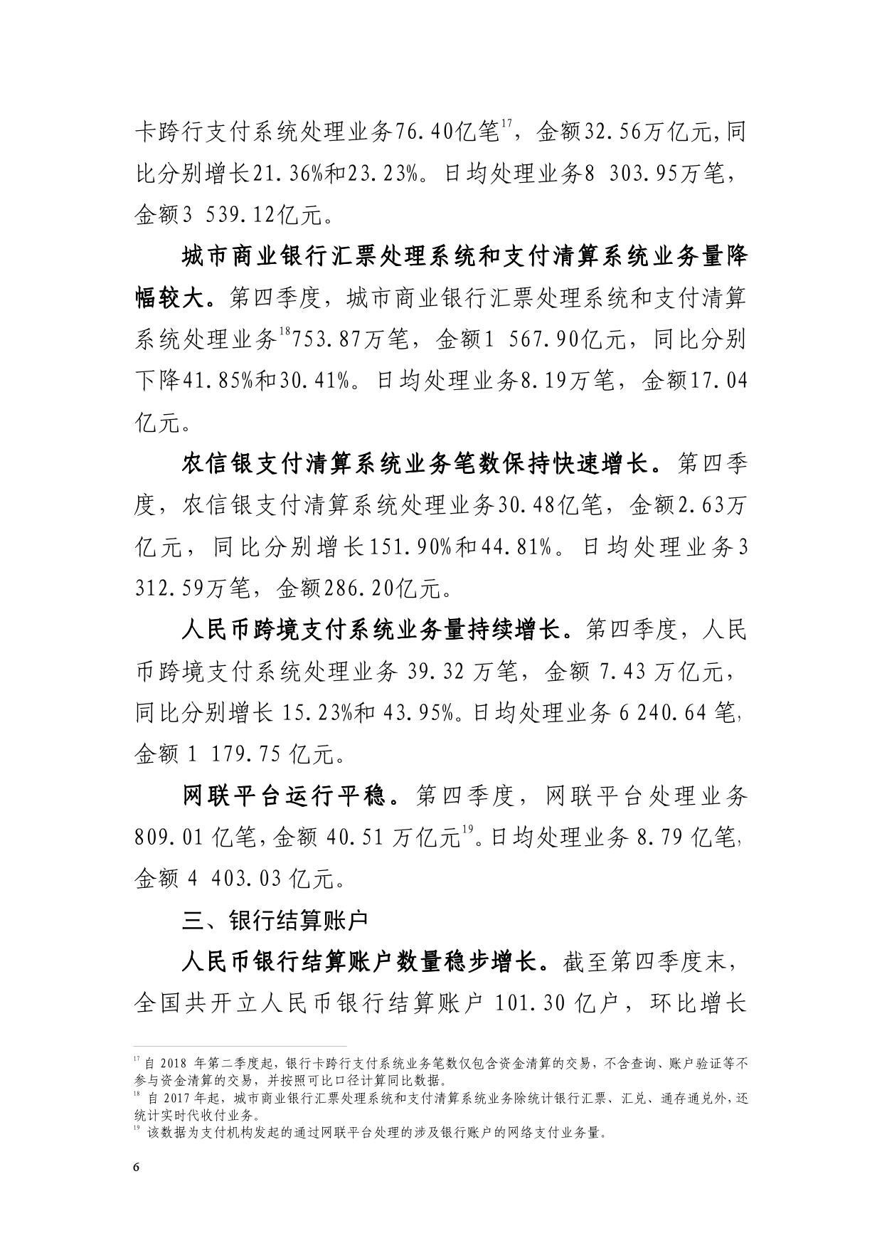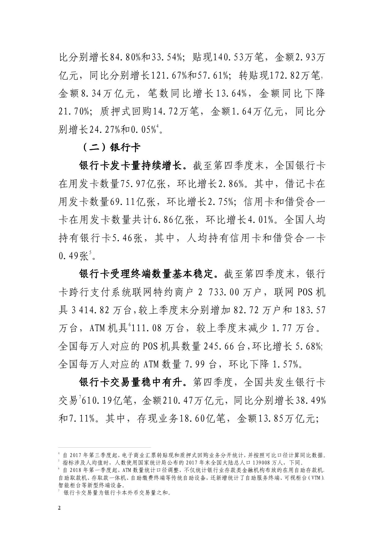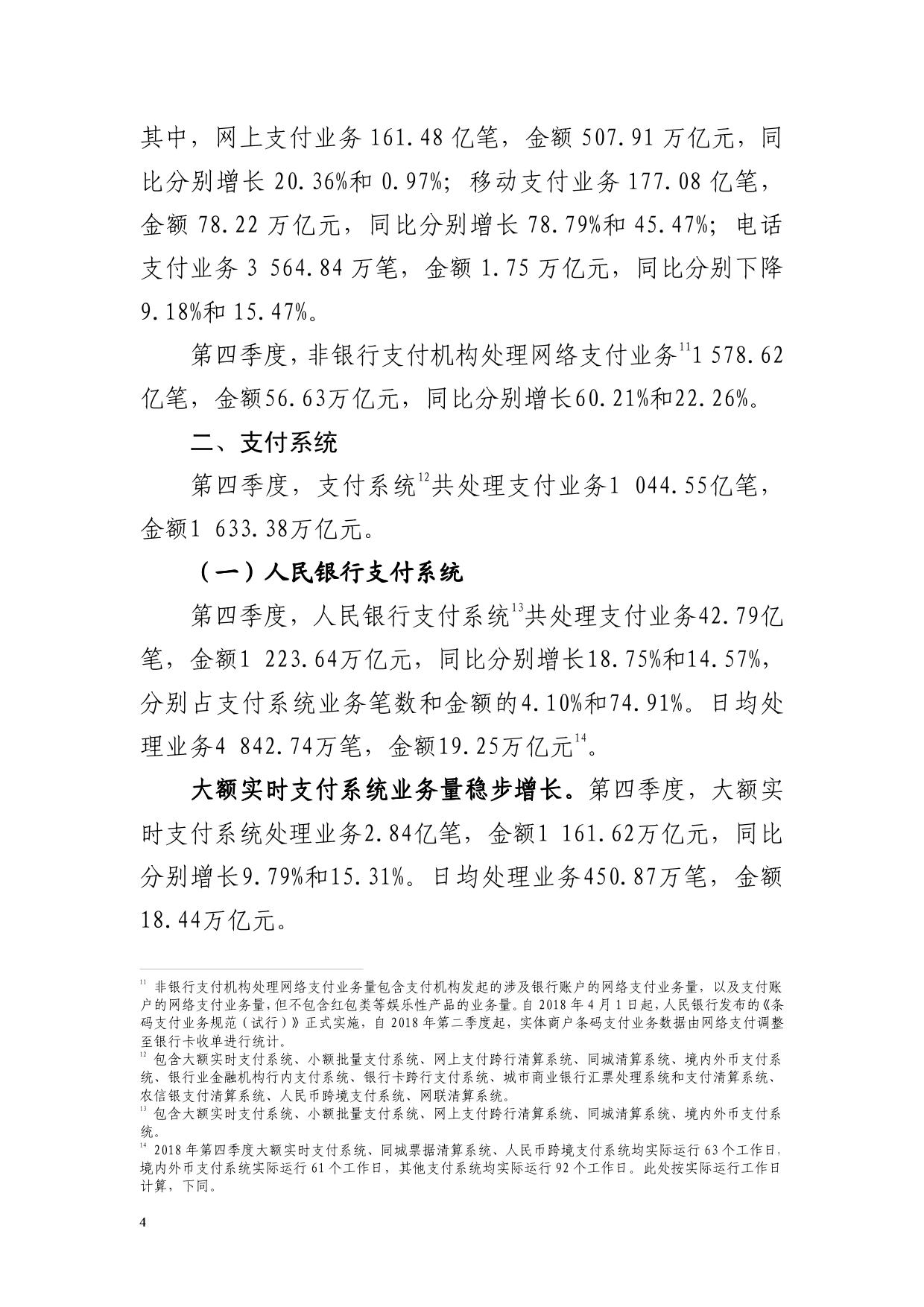 2018年第四季度支付业务统计数据显示,全国支付体系运行平稳,社会资金交易规模不断扩大,支付业务量稳中有升。