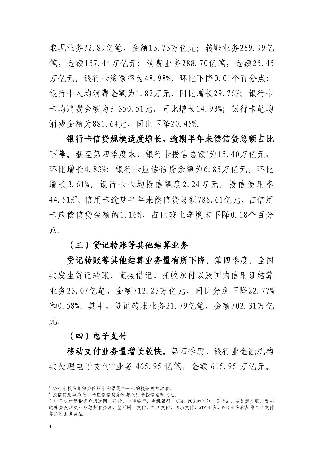 第四季度,全国银行业金融机构共办理非现金支付业务633.84亿笔,金额960.89万亿元,同比分别增长34.53%和0.33%。