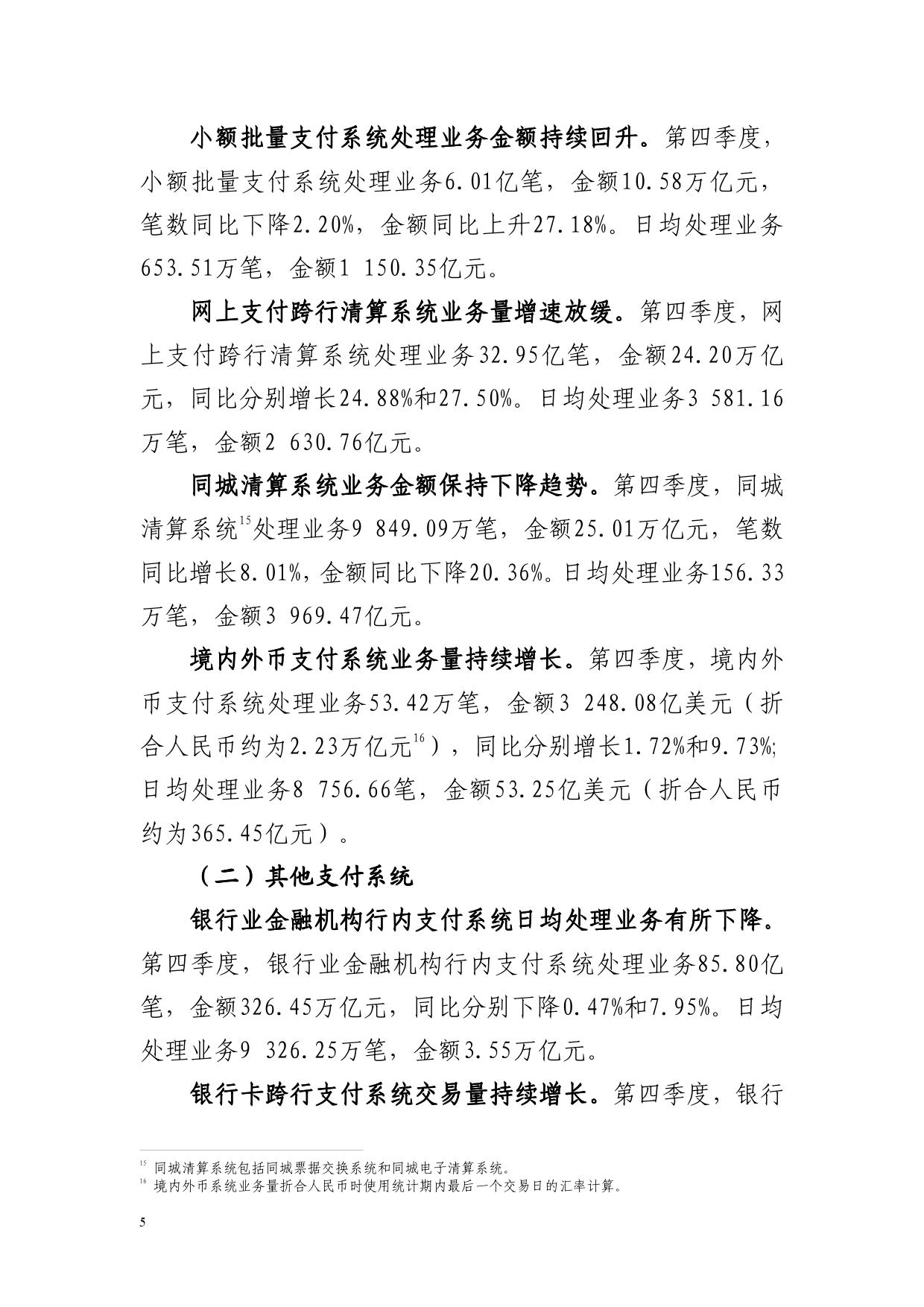 同城清算系统业务金额保持下降趋势。第四季度,同城清算系统处理业务9849.09万笔,金额25.01万亿元,笔数同比增长8.01%,金额同比下降20.36%。日均处理业务156.33万笔,金额3969.47亿元。