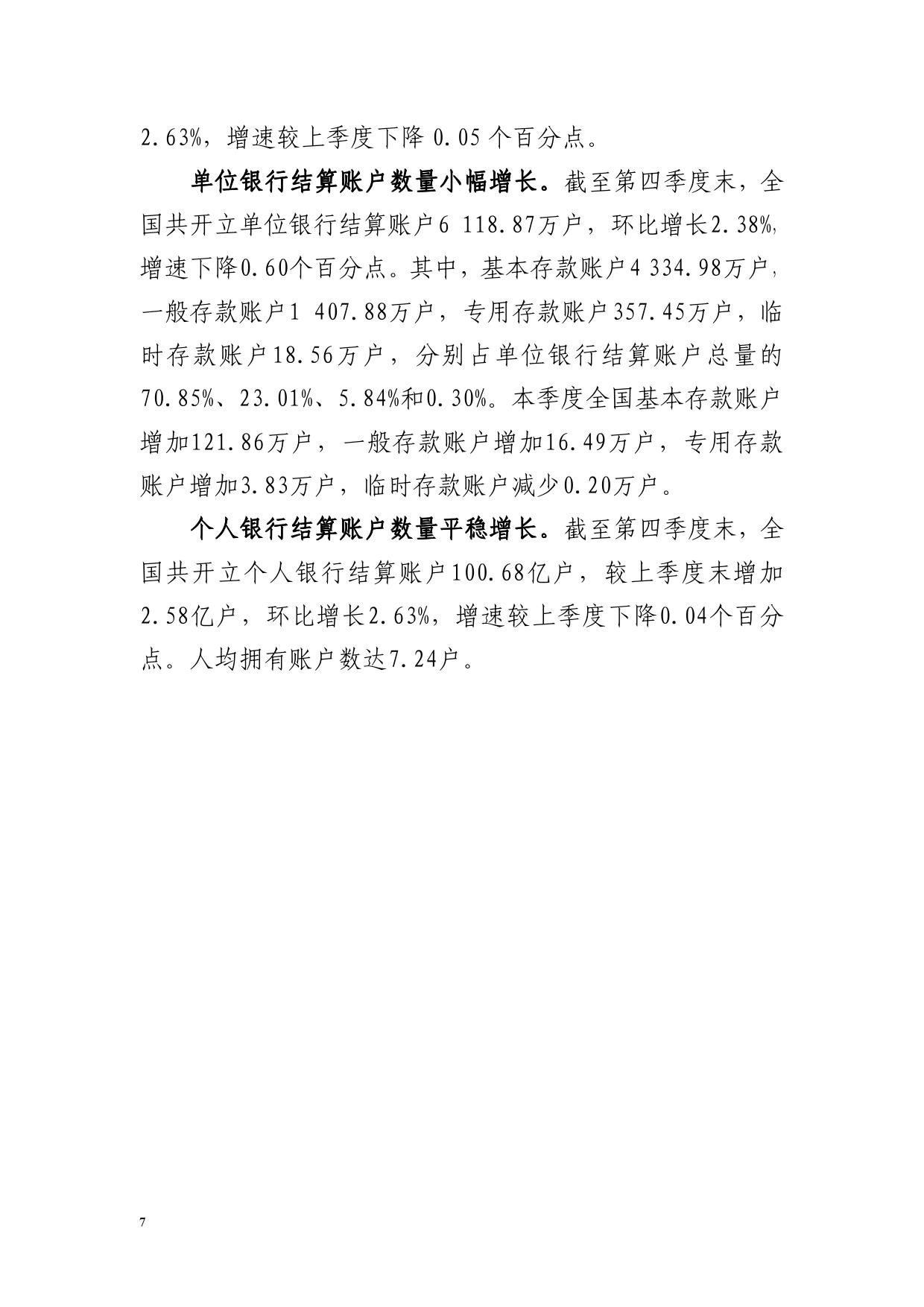 人民币银行结算账户数量稳步增长。截至第四季度末,全国共开立人民币银行结算账户101.30亿户,环比增长2.63%,增速较上季度下降0.05个百分点。