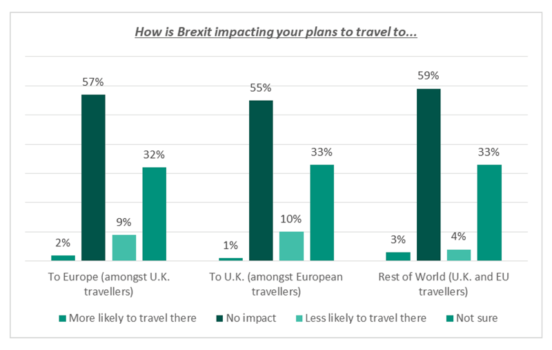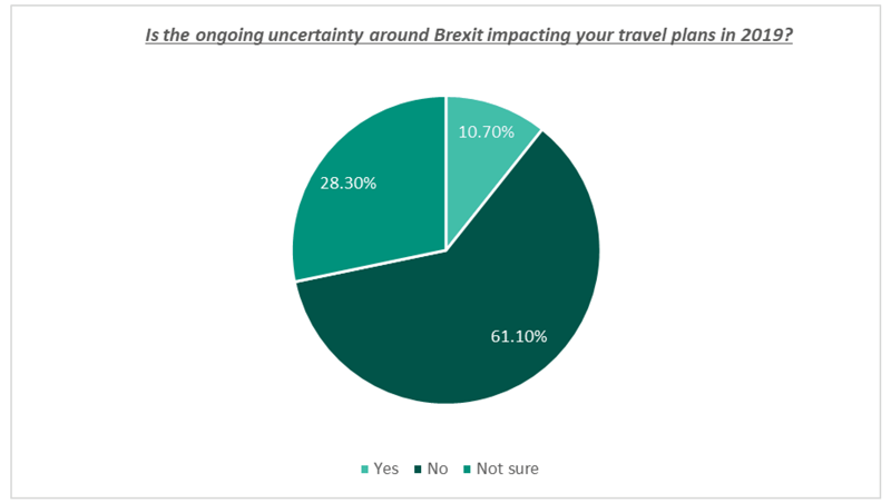 - 61%的受访者表示英国脱欧没有影响他们2019年的旅游计划,而11%的受访者称受到了影响。17%的英国游客和15%的欧洲游客称英国脱欧对他们2019年的度假计划产生了巨大影响。