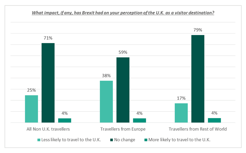 - 38%的欧洲游客称英国脱欧问题使他们对英国这一旅游目的地产生了不好的看法。