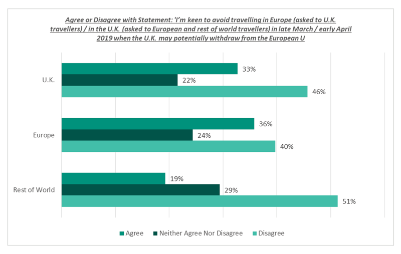 - 9%的英国游客称由于英国脱欧,2019年他们不愿去欧洲旅行,同样也有10%的欧洲游客不愿去英国旅行。