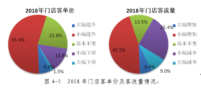 门店客单价方面,2018年绝大多数门店的客单价同比去年实现了不同程度的提升,占比78.2%。门店客流量方面,调查结果显示2018年52.1%的门店其客流量实现了不同程度的增加。