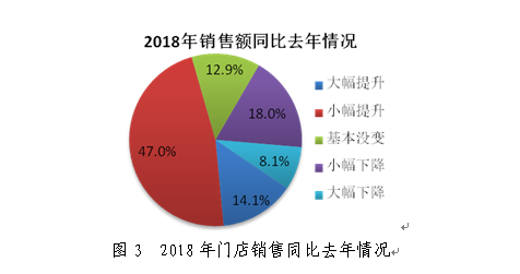 门店销售情况方面,2018年多数门店的销售额同比去年实现了不同程度的增长,占比61.1%。门店销售额的增长更多的是基于门店商品结构的调整、运营能力的提升、配送效率的提高等内部因素。门店的外部竞争环境变得更加激烈。