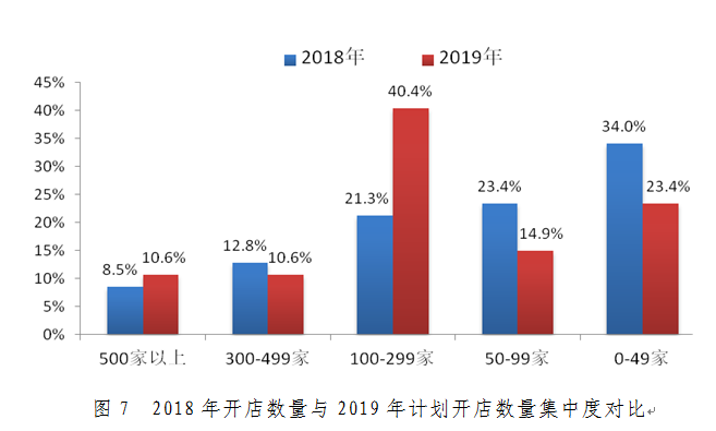从开店集中度来看,2018年开店数量集中在0-49家的企业较多,占到34.0%,而2019年开店数量集中的100-299家的企业较多,占到40,4%。同2018年开店数量相比较,开店数量明显提升。