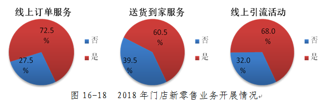 新零售赋予了便利店加载更多服务内容的可能。从门店新零售业务开展情况来看,2018年开展线上订单业务的门店占比72.5%;开展送货到家业务的门店占比60.5%;开展线上引流业务的门店占比68.0%。