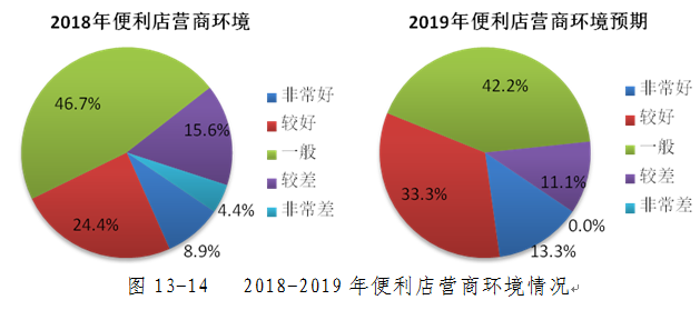 本次调查结果显示在营商环境方面,多数便利店企业认为2018年的市场营商环境一般,占比46.7%;并对2019年的市场营商环境提出了较高的预期,认为2019年市场营商环境会有所改善的企业占比明显增多。
