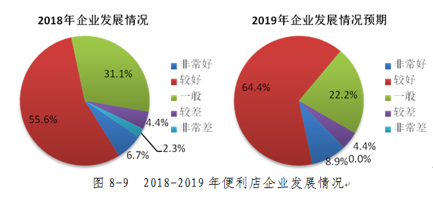 企业发展情况方面,2018年大多数便利店企业的发展情况良好,占比62.3%;在此基础上,对2019年企业发展情况预期保持乐观态度的企业占比明显增加。