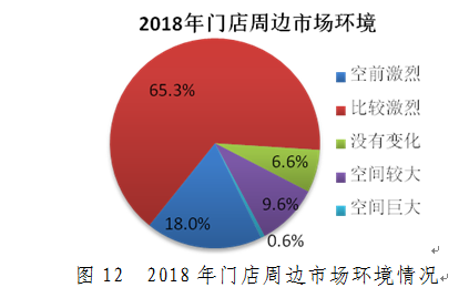 门店周边市场竞争环境方面,2018年绝大多数的门店都面临着激烈的市场竞争,占比83.3%。激烈的市场竞争对门店的运营带来了巨大的压力。