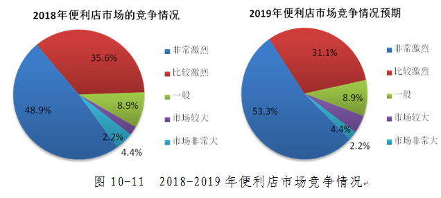 本次调查显示在市场竞争方面,绝大多数便利店企业认为2018年的便利店市场竞争激烈,占比84.5%;并且认为2019年的便利店市场竞争情况不会有所改善,将会愈发激烈。