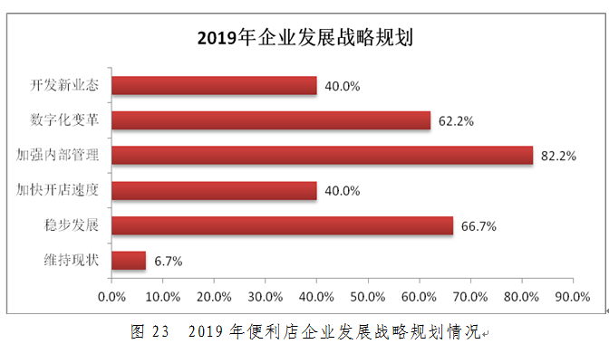 便利店需要精细化运营,其经营的本质不会因新技术和新理念的产生而发生改变。企业需要在商品开发、系统技术、会员管理、供应链建设等方面打好基础。同时,积极拥抱数字化变革,通过数字化技术赋能门店,提升门店价值。本次调查结果也显示,62.2%的企业将数字化变革列入了2019年企业发展战略规划当中。