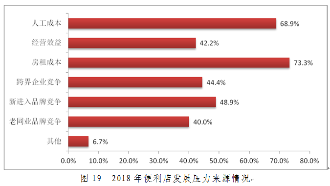 门店用工费用方面,2018年56.3%的门店用工费用小幅上涨,17.1%的门店用工费用出现了大幅上涨,便利店属于劳动密集型行业,用工费用的上升,会进一步挤压盈利空间,进一步加大门店运营的压力。