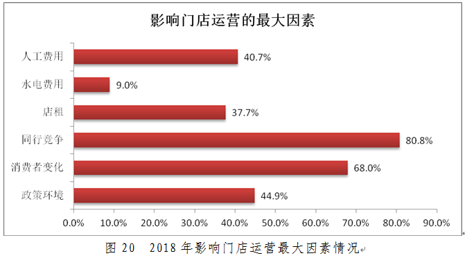 门店店租方面,2018年46%的门店店租出现了不同程度的上涨,店租的上涨对于门店的可持续运营带了的极大的威胁。有些门店会因为租房合同到期,店租的过度上涨而闭店。