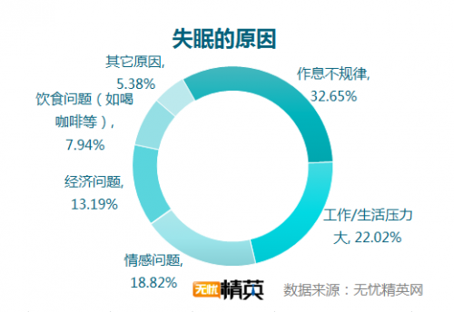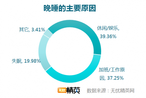 休闲/娱乐以及加班是造成精英们晚睡最主要的原因,39.36%的人因为休闲/娱乐而晚睡;37.25%的因为需要加班而晚睡;精英人群失眠的情况也比较多,每五个人中就有一人因为失眠而晚睡。