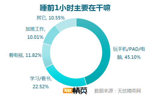 这么晚睡觉,睡前都在做什么?45.5%的职场精英会在睡前1小时中玩手机/PAD/电脑, 22.52%的人会在学习或是看书,11.82%的人会看电视。当然,并不是所有人,都能拥有悠闲的睡前时光,有10.01%的职场精英,睡前一小时仍在加班工作,可谓是“睡意不来,工作不止。”另外,37.25%的人因为工作而晚睡,但是睡前一小时主要在工作的只有10.01%的人。可见尽管因为加班导致晚睡,也还有不少人要娱乐一段时间才会睡觉。