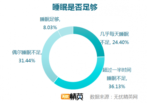 睡眠不足成为职场精英们普通存在的问题,24.4%的职场精英每天睡眠不足,36.13%的人有半数时间睡眠不足。也就是说高达60.53%人,一年有超过一半的时间睡眠不足,31.44%的人偶尔睡眠不足,仅有8.03%的受访者觉得自己睡眠充足。