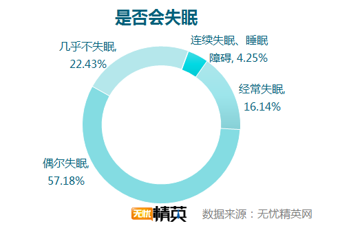 虽然多数人,因为工作和娱乐不能早睡,但也有一群人是想睡觉的时候却睡不着。受访精英中57.18%的人偶尔会失眠,接近20%的人会经常失眠,也就是说每5个人中就有1个人经常失眠。