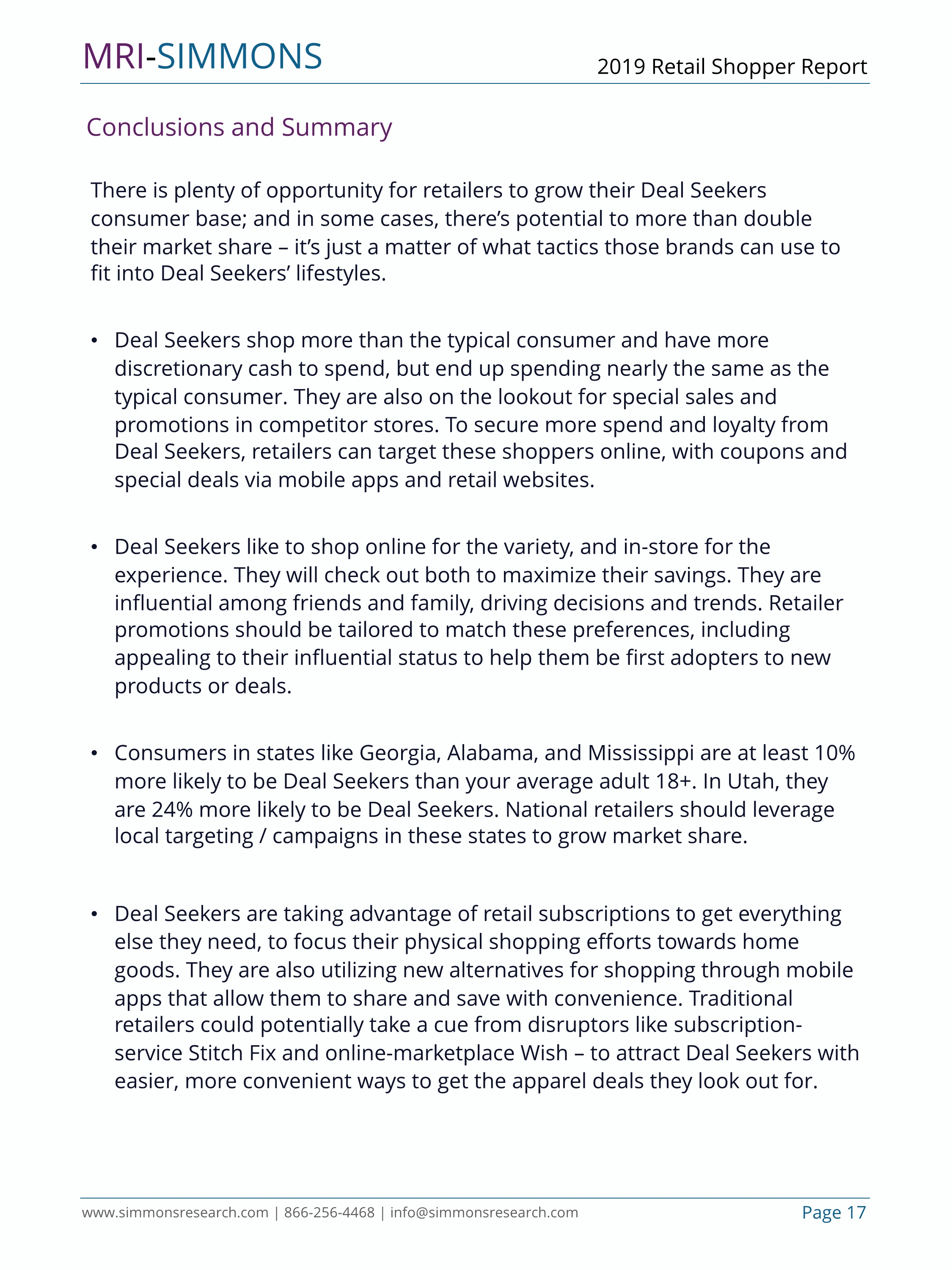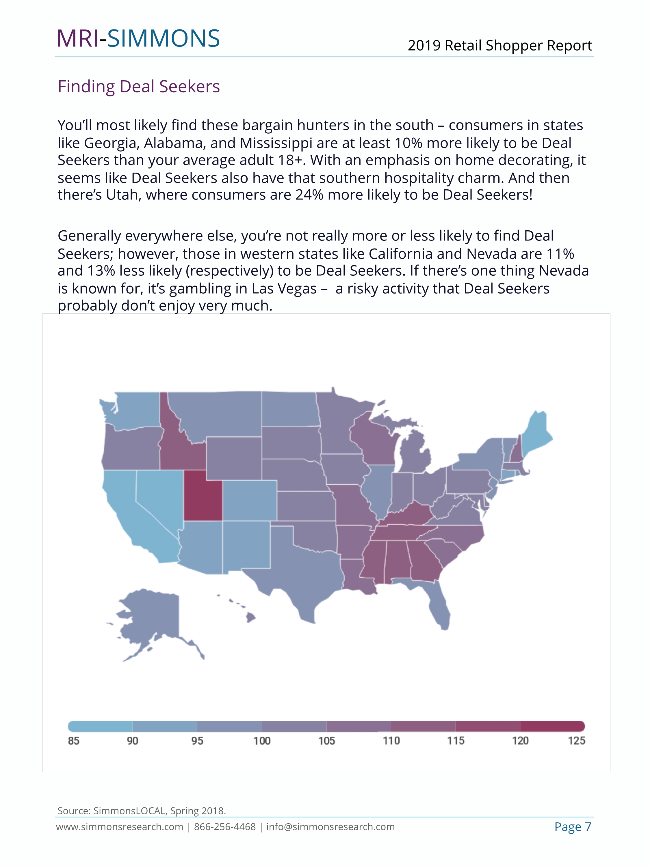 佐治亚州、阿拉巴马州和密西西比州的成年消费者比其他州更可能成为Deal Seekers。犹他州的消费者成为Deal Seekers的可能性比平均水平要高出24%。全国性的零售商应利用这些州的当地活动来扩大市场份额。